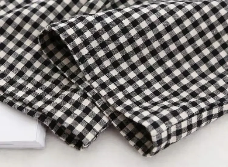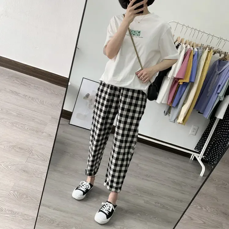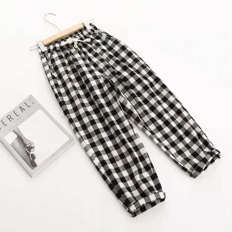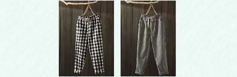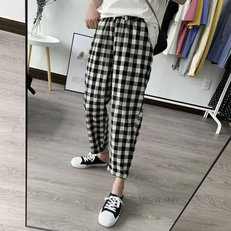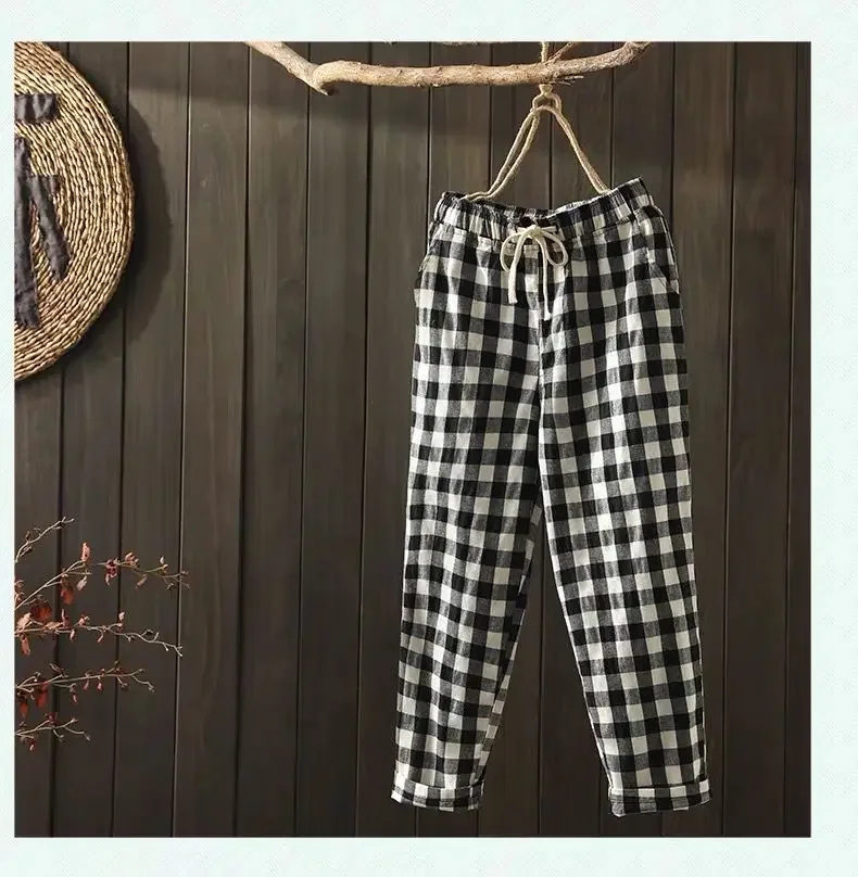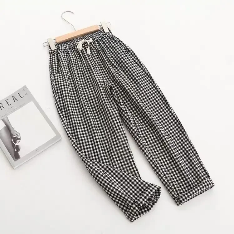 2024 Spring Summer Plaid Pants Women's Harem Pants Capris Drawstring Waist Large Size Casual Loose Cotton Linen Trousers Women