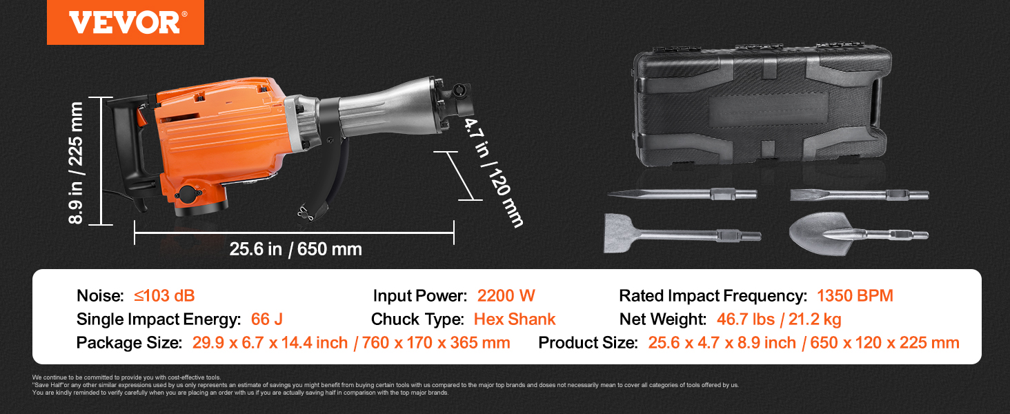 Imagine standing at the forefront of your construction project, armed with a powerful tool that transforms your toughest challenges into mere tasks. Meet the VEVOR Demolition Jack Hammer, the ultimate companion for anyone who demands excellence in their work – whether you are breaking through concrete, trenching, or renovating your space. This heavy-duty electric jack hammer isn’t just a tool; it’s your reliable partner in making your construction dreams a reality.    Born from a quest for perfection in demolition, the VEVOR Jack Hammer boasts a robust 2200 watts of motor power and an astounding 1400 BPM impact rate. It was meticulously designed to tackle the most formidable surfaces effortlessly, taking the exhaustion out of heavy labor. When you pick up this jackhammer, you’re not just wielding equipment; you’re embracing innovation and durability that stands the test of time.    With four versatile chisel bits – including a clay spade chisel, scraping chisel, flat chisel, and point chisel – you can effortlessly skim through a myriad of construction tasks. Each chisel is crafted from heat-treated alloy steel to withstand intense pressure, allowing you to customize your approach based on the job at hand. Plus, the quick assembly and disassembly means you will spend less time on setup and more time making progress.    As you grip the 360° adjustable fore handle, you’ll feel the reassurance of control at your fingertips. The slip-proof rubber grip minimizes fatigue and absorbs vibrations, ensuring every strike lands with precision. Picture yourself working seamlessly, moving between tasks, and feeling the satisfaction of accomplishment wash over you as the jack hammer seamlessly adapts to your every need.    The VEVOR Demolition Jack Hammer speaks through the praises of its users. “This tool has changed the game for me,” says Jake S. “It cuts through concrete like a hot knife through butter. I’m amazed at its power and ease of use.” Another user, Linda H., raves, “The vibration control is a game-changer. I can work longer without feeling worn out. Best investment I’ve made for my projects!”    Are you ready to elevate your construction game? Don't let your next big project turn into a struggle. Invest in the VEVOR Demolition Jack Hammer today, and experience the unrivaled strength and efficiency it brings. Unlock your potential, tackle any challenge head-on, and step confidently into the world of professional-grade demolition tools!