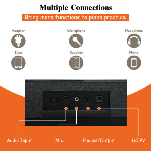 Specifications: Color: Black  white Material: PS  iron Product dimension: 33" x 13" x 3.5" Stand height: 22.5"/25"/27" Stool size: 15.5" x 12" x 17"/19"/20" Net weight: 17.5 lbs Box Qty: 1(May vary by batch)Package includes: 1 x 61-key digital piano 1 x Stand 1 x Stool 1 x Microphone 1 x Headphone 1 x Adapter 1 x Music score shelf 1 x User manual
