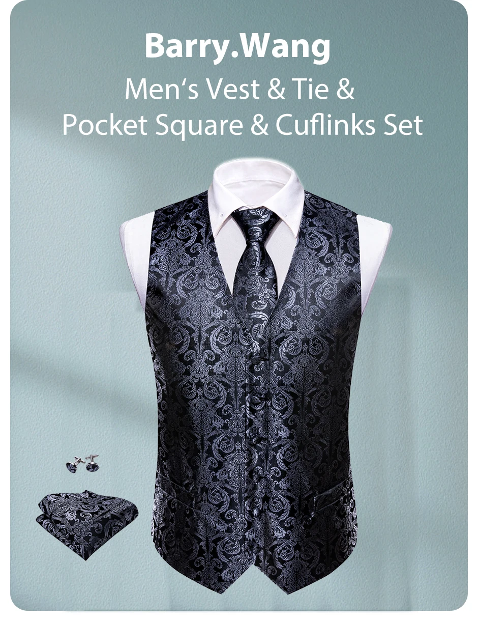 Barry.Wang Men's Suit Vest Gray Jacquard Floral Waistcoat Tie Pocket Square Cufflinks Set for Male Formal Casual Business Party