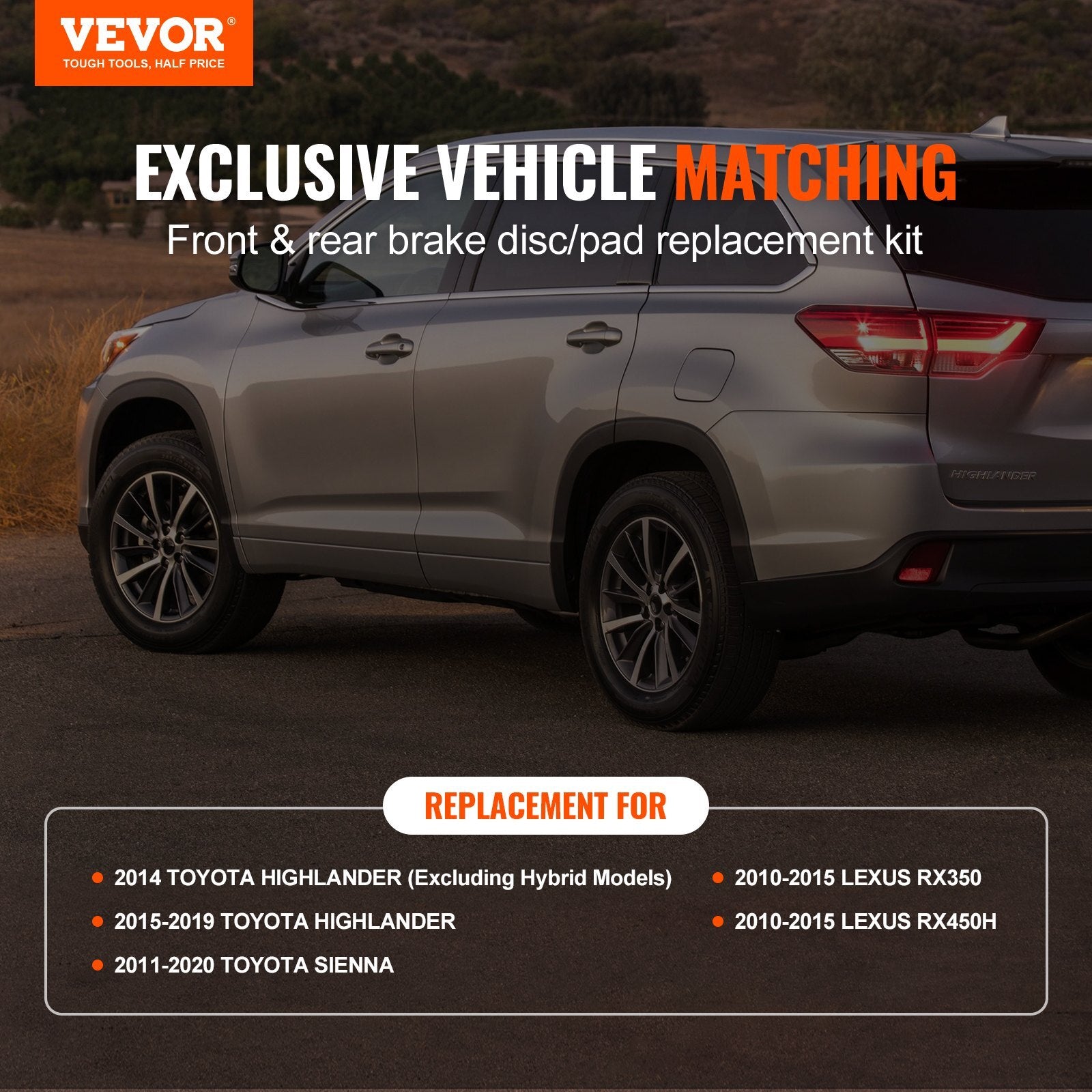 Compatible Vehicle Models: 2010-2015 Lexus RX350, 2010-2015 LexusRX450H, 2014 Toyota Highlander (Excluding Hybrid Models), 2015-2019Toyota Highlander, and 2011-2020 Toyota Sienna,Brake Rotor Size:Φ12.9×1.9 inch/328×49.3 mm (Front), Φ12.2×2.5 inch/309×62.7 mm(Rear),Item Model Number: HQP519/1907,Product Weight: 70.5 lbs/32kg,Brake Pad Size: 6.6×2.3×0.7 inch/166.5×59×17 mm (Front),4.5×1.8×0.6 inch/115×46×15 mm (Rear),Brake Pad Part Number: P-1324(Front), P-1391 (Rear),Main Material: Brake Disc: Cast Iron(HT250), Brake Pad: Ceramic,Brake Rotor Part Number: S-31511(Front), S-31544 (Rear)