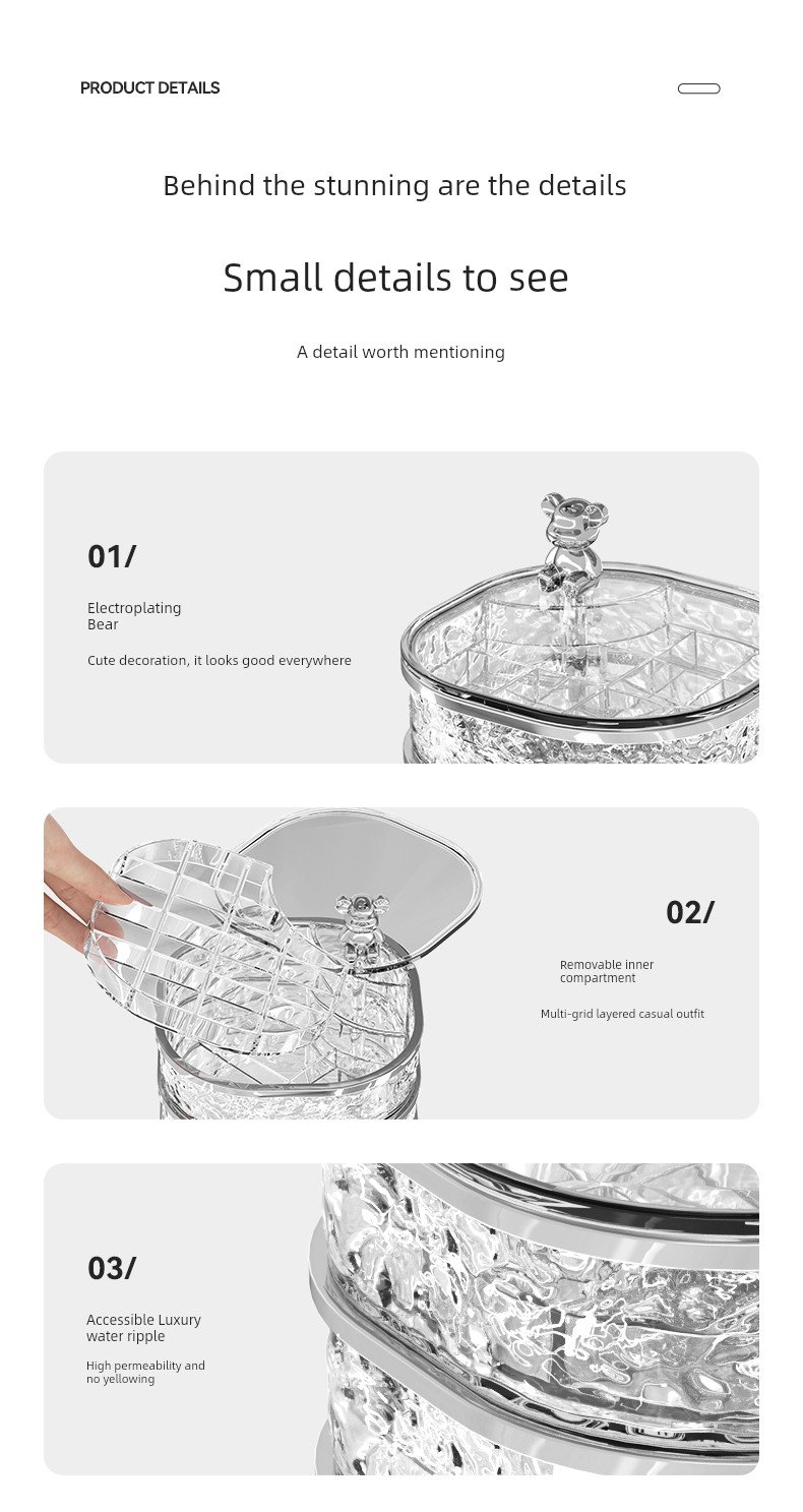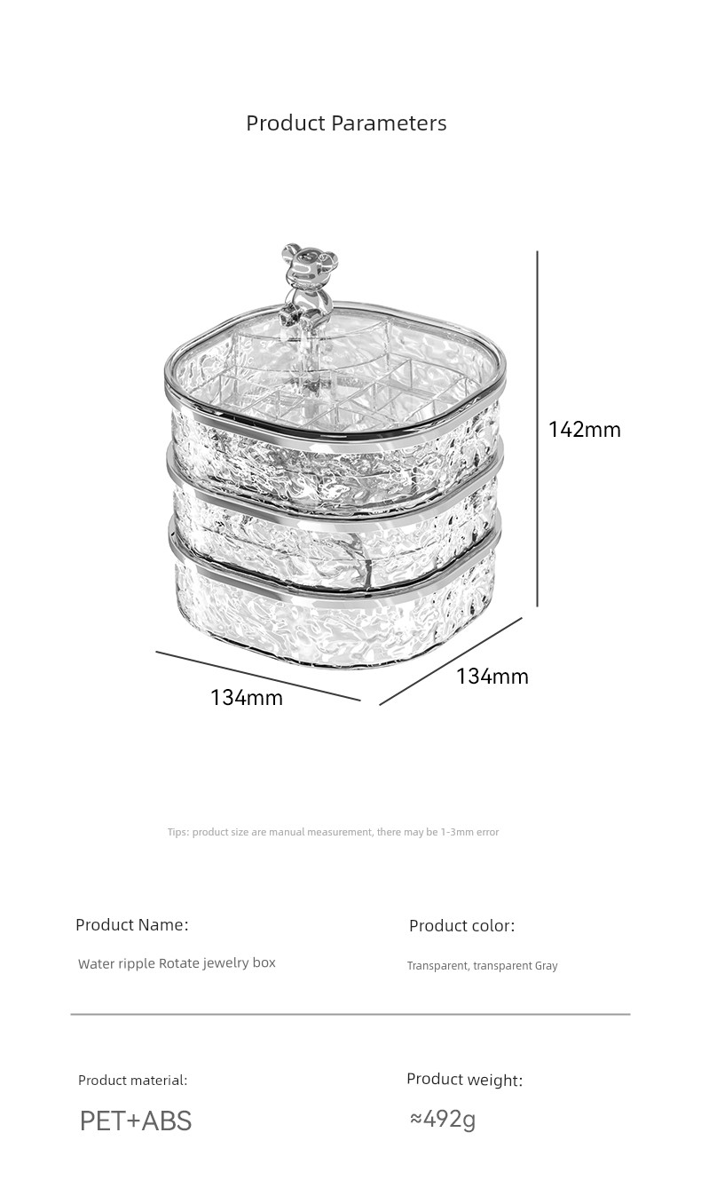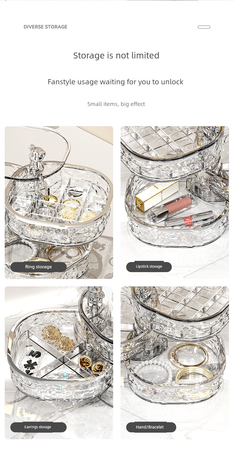 Imagine a world where your precious jewelry is lovingly organized and beautifully displayed. Welcome to the Elegant Rotating Jewelry Organizer Box, a delightful sanctuary for your earrings, necklaces, bracelets, and hair accessories. This isn't just a storage solution; it's a charming centerpiece for your vanity. Crafted with care, this high-grade jewelry box addresses the all-too-common dilemma of tangled chains and misplaced earrings. Every compartment is designed with purpose, ensuring your treasures are not only protected but also showcased in a way that brings joy every time you reach for them. Revel in the ease of access with its innovative rotating design. Picture yourself effortlessly spinning the box to find the perfect accessory for your outfit, all while enjoying the delightful sight of your most cherished pieces. With designated slots for earrings, barrettes, necklaces, and bracelets, this organizer takes the hassle out of getting ready. As you lift the lid, the soft lining greets you with warmth, and the sleek compartments beckon your jewelry, protecting it from scratches and dust. Visualize the luxurious feel of the box in your hands and the satisfaction it brings to see your items neatly arranged, inviting you to mix and match like never before. Don’t just take our word for it; listen to the excited voices of those who’ve transformed their routines with the Elegant Rotating Jewelry Organizer. \