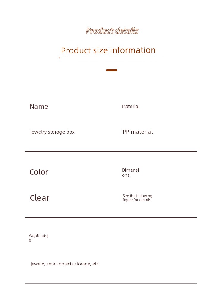 Imagine a world where your cherished jewelry is always at your fingertips, beautifully arranged and safeguarded against dust and tarnish. Introducing our Elegant Transparent Jewelry Organizer Box — the ultimate solution for keeping your delicate earrings, necklaces, and stud earrings beautifully displayed and perfectly protected. This exquisite jewelry box was born out of a desire to celebrate your most treasured pieces while keeping them in pristine condition. Have you ever found yourself rummaging through tangled necklaces or hunting for that perfect pair of earrings? We understand the frustration, and that's why we've created a stunning storage option that combines elegance with practicality. Each compartment of this jewelry box is designed with care, providing a dustproof and anti-oxidation environment for your accessories. Made from transparent materials, it allows you to easily admire your collection without having to open the box. Picture each piece shining brightly as it greets you each day, making every selection feel like a special occasion. Visualize the moment you open your jewelry box and are mesmerized by how beautifully organized your treasures are. Each elegant item is displayed like a precious gem reflected in daylight, exuding beauty and charm. The tactile experience of gently lifting each piece from its compartment brings a sense of joy and celebration to your daily routine. But don’t just take our word for it. Here's what our satisfied customers are saying: 'This jewelry organizer has transformed how I store my accessories! I love the visibility and how easy it is to find my favorite pieces' - Emily T. 'No more tangled mess! This box is a lifesaver, and it looks stunning on my dresser' - Jessica L. Are you ready to elevate your jewelry storage experience? Don’t let your beautiful items fade into the background. Make this Elegant Transparent Jewelry Organizer Box yours today and embrace a life of elegance, convenience, and style!