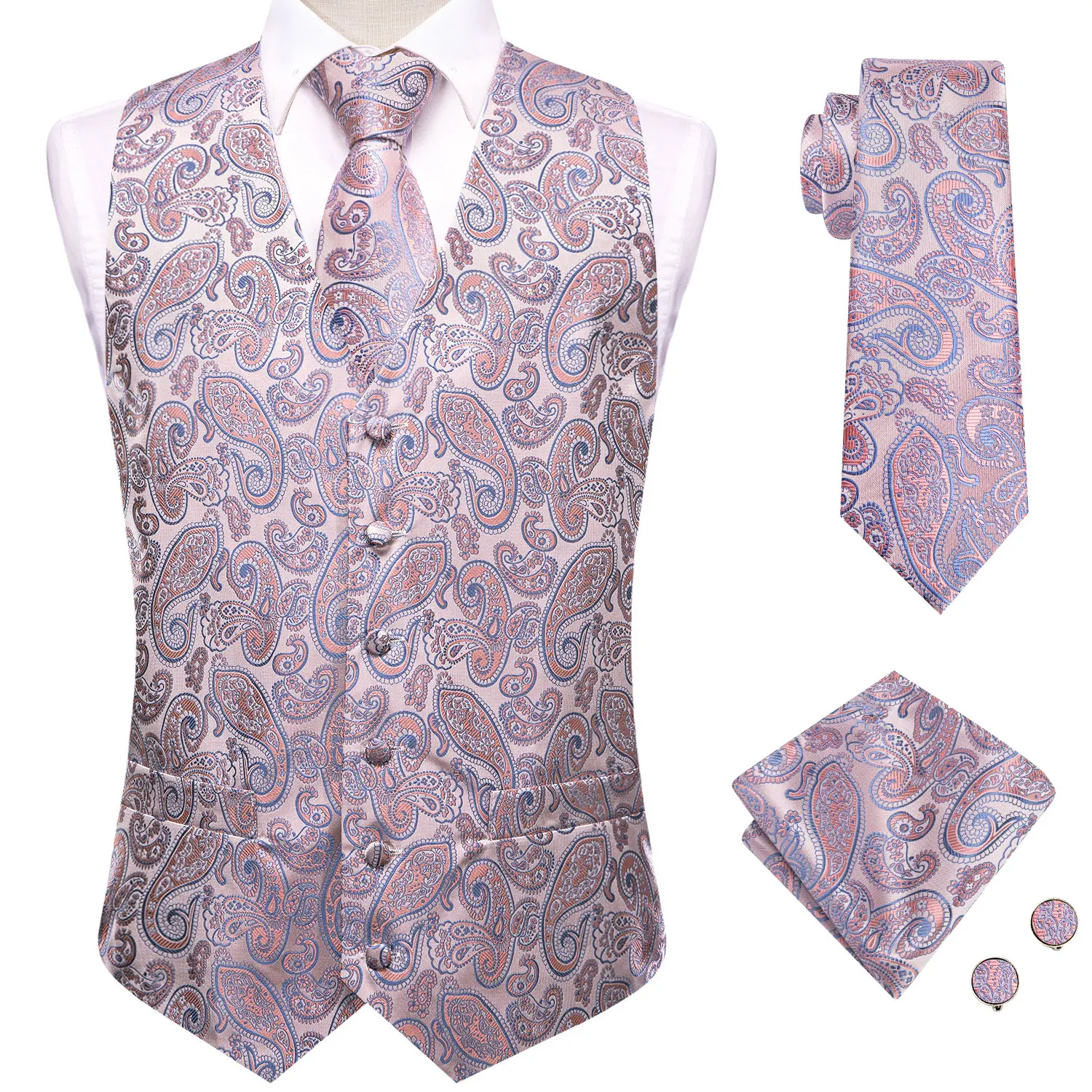 Hi-Tie Wedding Coral Pink Mens Vest Silk Tie Set Adjustable Jacquard Waistcoat Jacket Necktie Hanky Cufflinks Formal Party Gifts