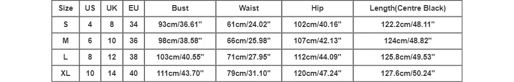 | Size:XL | US:10 | UK:14 | EU:40 | Bust:111cm/43.70'' | Waist:79cm/31.10'' | Hip:120cm/47.24'' | Length(Centre Black):127.6cm/50.24'' |