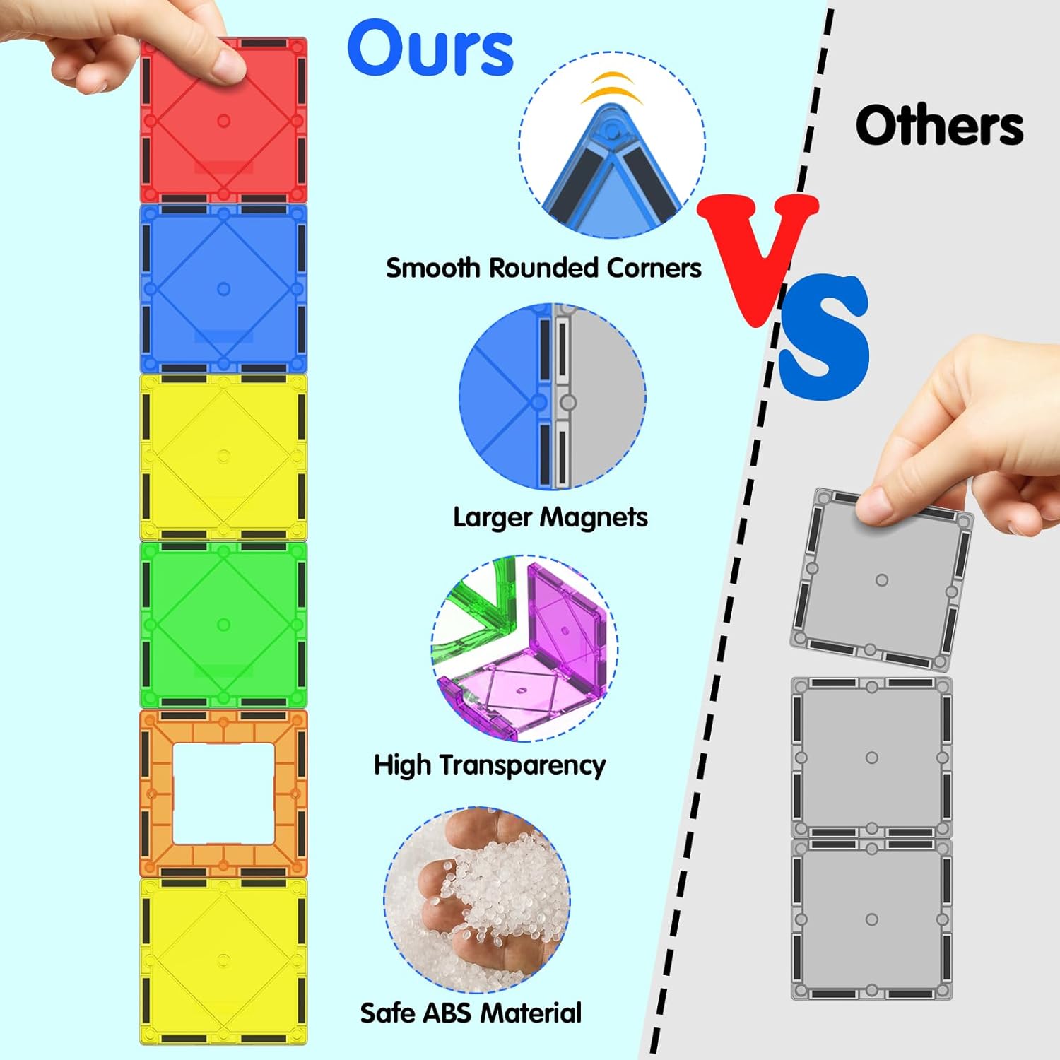 - High transparence. Bright colors, rainbow shadow will show up when the lligh shine through the magnetic tiles. Round edges, safe to play,not easy to scratch.