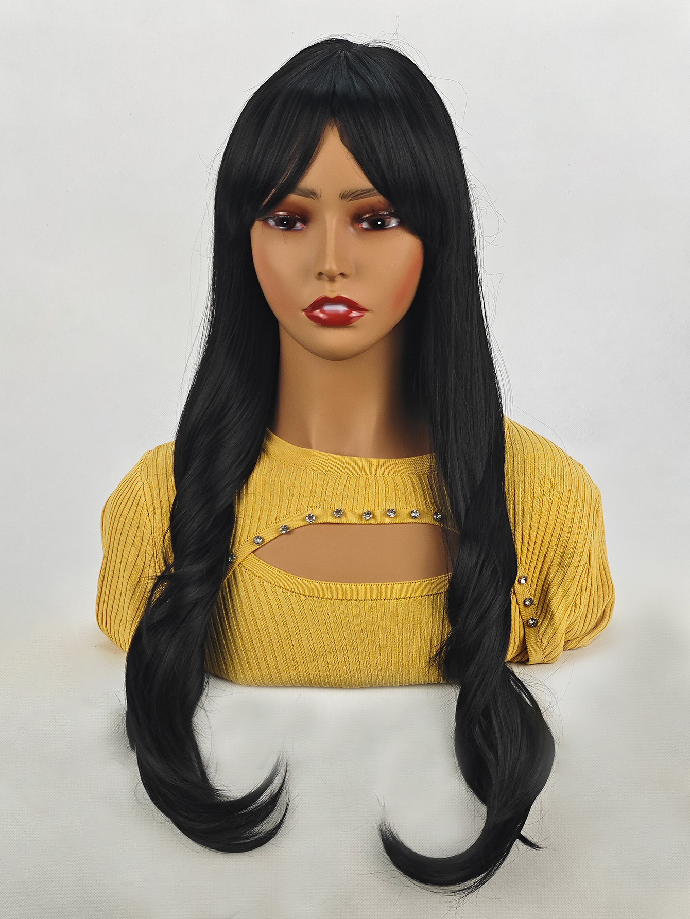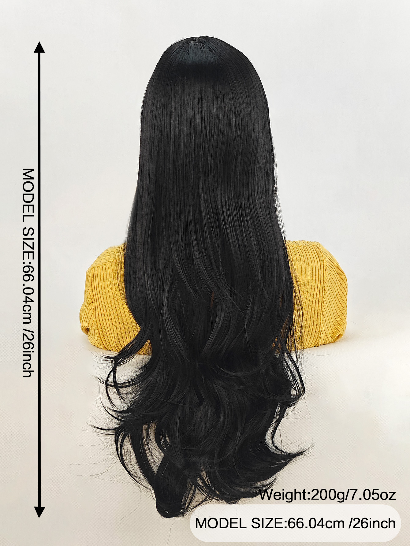 Medium-length wavy straight hair fully machine-made wig 26 inches natural black Heat-resistant fiber high-temperature silk wig dyeable and soupable bangs synthetic wig. Natural Black Wave Wig For Women Curly Wave Wig Natural Look Synthetic Heat Resistant