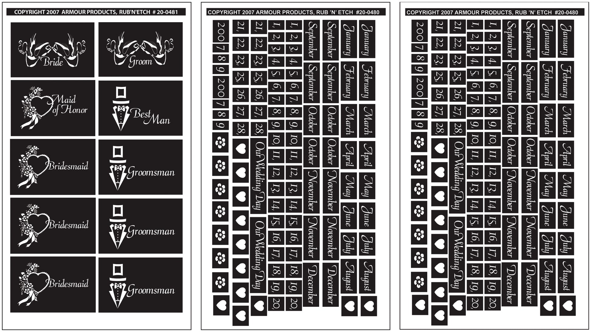 Armour-Rub 'n Etch Glass Etching Stencil.  These small and detailed rub-on stencils were Designed for small glass etching projects such as stemware, table mirrors, cabinet doors, sun catchers, bottles and jars.  When you combine these pre-cut, Rub N Etch stencils with Etch Glass Etching Cream (not included) you create the easiest, fun-filled way to create beautiful etched designs to permanently decorate and personalize your household glassware, windows and mirrors.  Each Rub N Etch stencil sheet was design for one use only.  This package contains three 5x8in sheets, illustrated instructions and wood applicator stick.  Available in a wide variety of designs.  Made in USA.