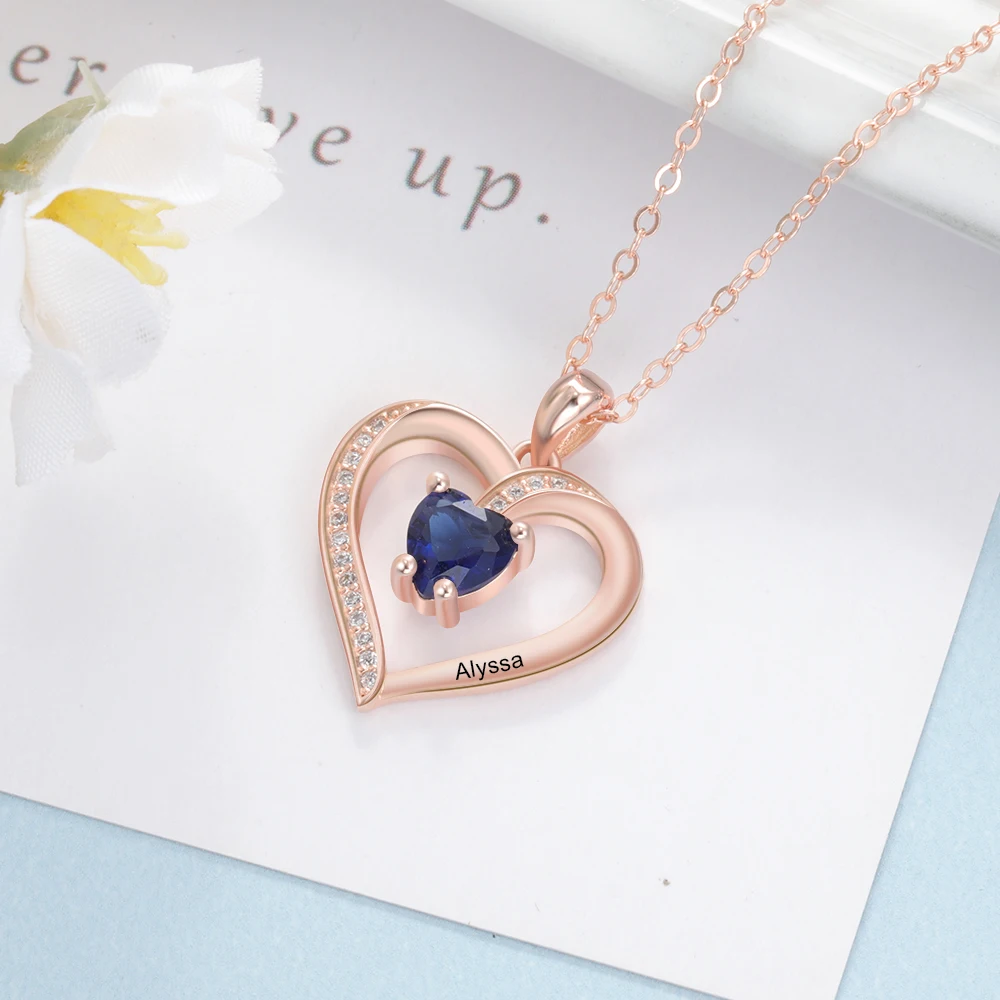 Personalized Engrave Name Heart Pendants with Zirconia Customize Birthstone Necklaces for Women Mother's Day Gift (NE103356)