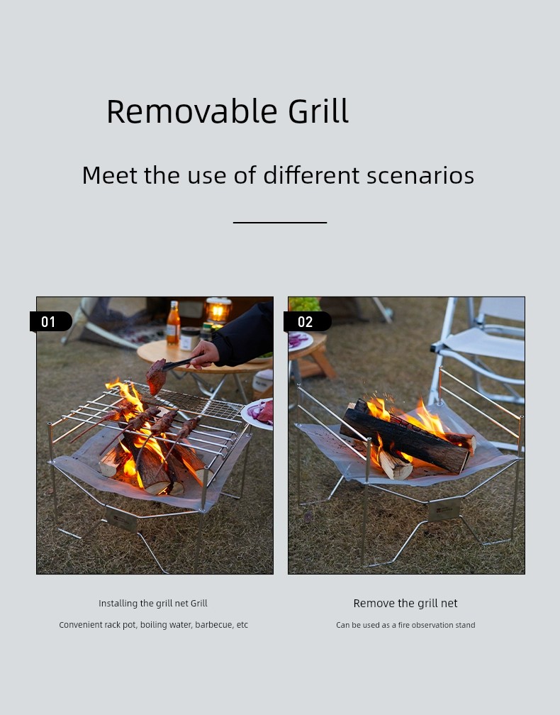 Elevate your outdoor experience with this Portable Multi-Functional Campfire Grill & Stove for Cooking, Barbecuing, and Heating. Perfect for camping enthusiasts who crave convenience and versatility in their outdoor cooking setup. Why you'll love it: - Compact and Foldable for Easy Transport. - Multi-Functional Design for Cooking, Barbecuing, and Heating. - Durable and High-Quality Materials for Long-Lasting Use. - Perfect Fit for Camping, Picnics, and Backyard Gatherings. - Exclusive Limited-Time Offer for Outdoor Lovers. Crafted from premium materials, this outdoor campfire rack stove offers exceptional durability while ensuring efficient heat distribution for all your cooking needs. Its foldable design allows you to set it up and take it down effortlessly, making it the perfect companion for all your outdoor adventures. To use, simply unfold the grill, set it up on a stable surface, add fuel, and let the flames create the perfect cooking environment for your meals. Ideal for making hot drinks, grilling your favorite snacks, or warming up on cold nights. Don’t miss out, grab yours today and take your outdoor cooking to the next level!