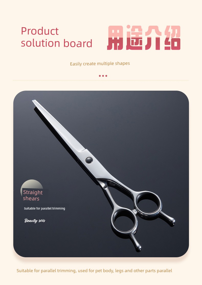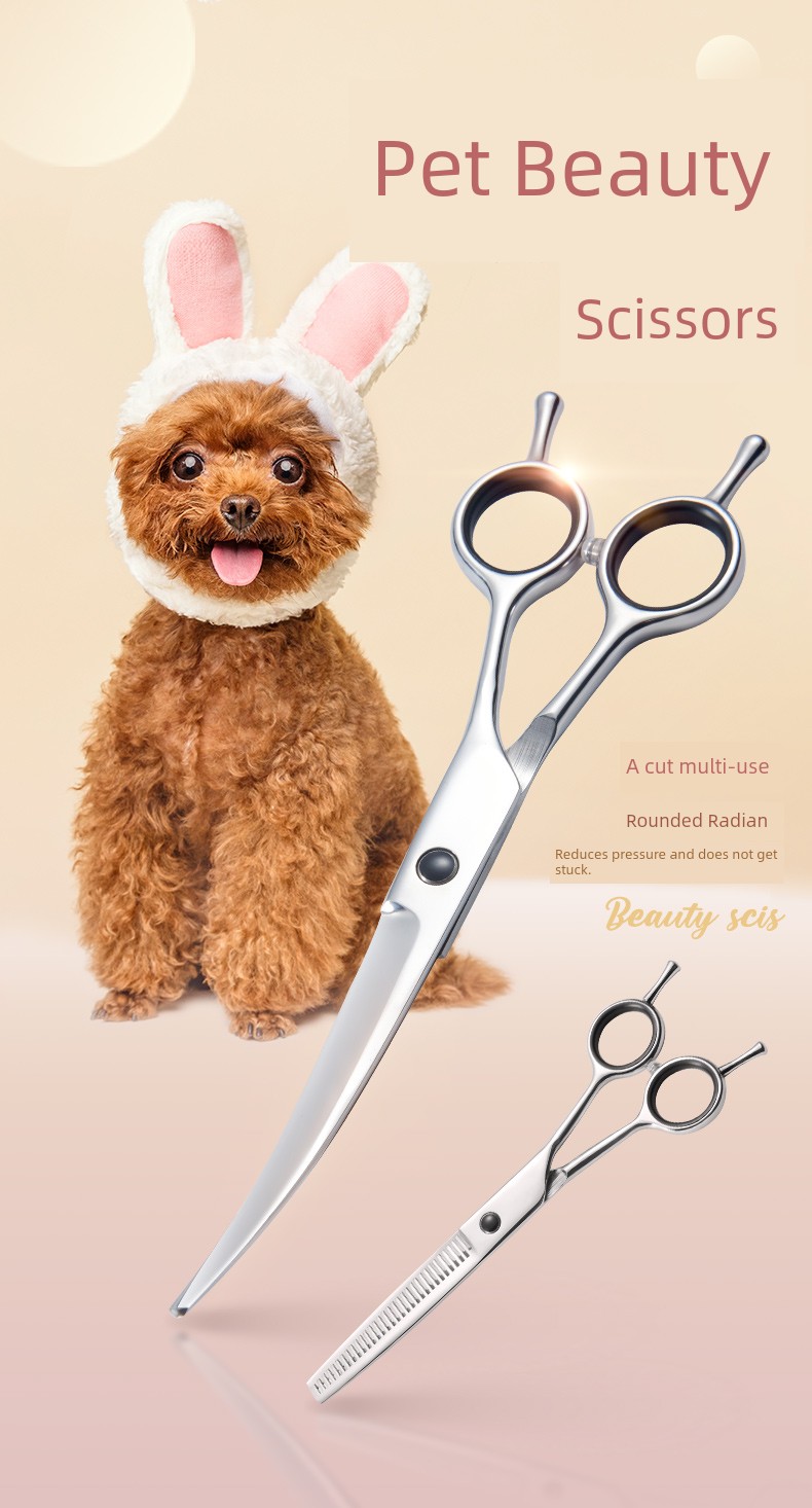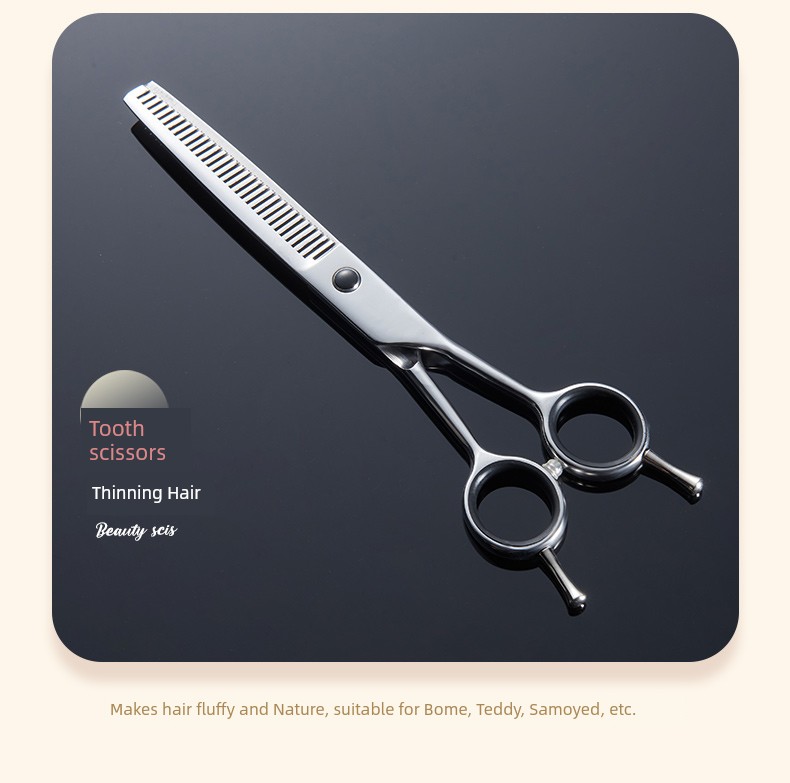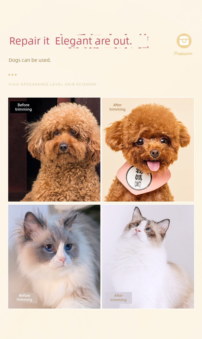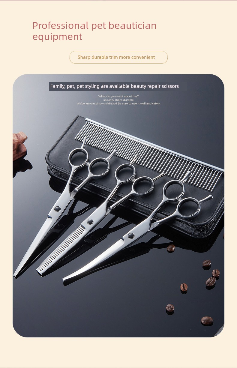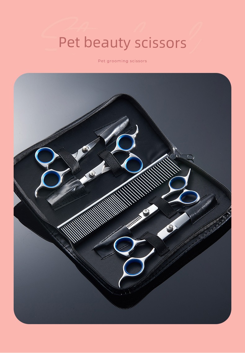 Imagine stepping into a serene space where every snip of your scissors brings not only a touch of elegance to your furry friend but also deepens the bond you share. Welcome to a transformative journey of pet grooming with our Professional Pet Grooming Scissors Set – an experience designed to elevate grooming from a mundane task to a cherished ritual of love and companionship.Every pet owner understands the frustration of outdated grooming tools that dull your passion for pampering your pet. Born from the inspiration of professional groomers, this meticulously crafted scissors set addresses the most common problem faced by pet parents: dull and ineffective scissors. With this set, you don’t just maintain your pet’s glorious coat; you create a soothing experience that you both can enjoy right in your own home.Featuring a variety of curved scissors and hair trimming scissors, each tool in this set is designed with your needs in mind. The ergonomic handles ensure you can groom your pet without experiencing hand fatigue, while the razor-sharp stainless steel blades glide effortlessly through fur, giving you the precision and control necessary to achieve salon-worthy results. Imagine your pet's coat becoming smoother and shinier, all while avoiding the stressful environment of a grooming salon.As you pick up the scissors, you can feel the quality in your hands. Visualize the joy radiating from your pet as they are transformed into a chic companion ready for a day out. Picture how every snip not only beautifies their fur but also strengthens the bond you both hold dear. The act of grooming becomes a ritual you both will cherish, fostering trust and affection.But don't just take our word for it; let our satisfied customers speak for the experience. “These scissors have changed grooming time from a hassle to a delight! My dog looks fantastic, and I actually enjoy the process now,” expresses Jessica T. Meanwhile, Michael S. shares, “I was amazed at how easy it was to achieve a professional finish at home; highly recommend this grooming set!” These heartwarming testimonials showcase the transformative power of our grooming scissors set.Are you ready to elevate your grooming experience and enrich the bond with your furry friend? Don’t wait! Invest in your pet’s grooming journey today with the Professional Pet Grooming Scissors Set, and witness how your beloved companion shines like never before.