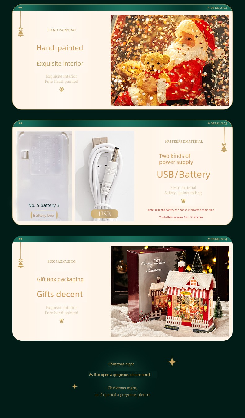 Imagine a cozy winter evening, the soft glow of a night lamp illuminating your space while the enchanting melody of classic carols fills the air. Welcome the Santa Claus Night Lamp Music Box into your home, where holiday magic comes alive and every night is a festive celebration. This delightful decoration isn’t just a lamp; it’s a token of joy that elevates your festive spirit. Inspired by the warmth of traditional holiday decor, the Santa Claus design brings a sense of nostalgia, making it the perfect addition to your Christmas scene. Whether it's sitting gracefully on your desktop or adorning your living room, this charming piece instantly transforms your space into a winter wonderland. Featuring a soothing warm light that creates a tranquil ambiance, this night lamp is perfect for curling up with a good book or drifting into peaceful sleep after a day filled with holiday cheer. The gentle melody that plays adds an extra layer of magic, making it a joy for both kids and adults alike. As you wind down in the evening, let the soft glow and soothing tunes carry you away to dreamland. Picture this: it’s a snowy evening. You gather with loved ones around the warm glow of the Santa Claus Night Lamp. The kids point in wonder as the music softly plays, and you can see the joy on their faces. It’s moments like these that create lasting memories, reminding you of the true spirit of the holidays – togetherness, laughter, and love. Here’s what our happy customers are saying: \ 'This night lamp is not just beautiful; it’s become a family tradition during the holidays. We love gathering around it with the music playing!' - Lisa T. \ 'Such a perfect gift! My kids adore it, and it lights up our home with joy.' - Patrick R. Don’t let this holiday season pass by without the Santa Claus Night Lamp Music Box. Bring home the charm, embrace the spirit of Christmas, and make every night a night of celebration. Order yours today and ignite the magic of the season!