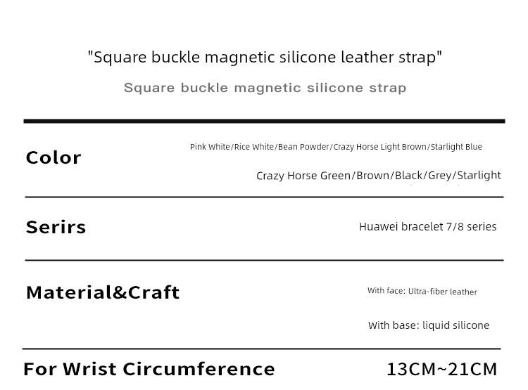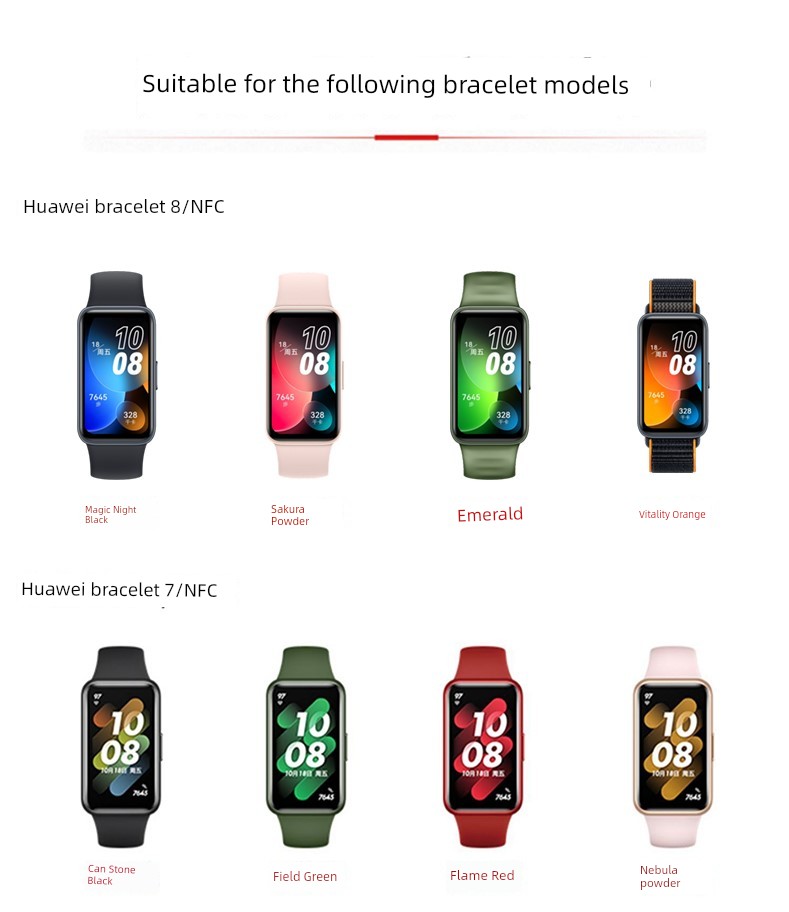 Elevate your smartwatch game with our Stylish Silicone Replacement Strap designed for Huawei Watches, blending comfort and elegance effortlessly. Why you'll love it:- Premium high-quality silicone ensures durability and style.- Classy magnetic NFC metal buckle for effortless wear.- Lightweight and breathable, perfect for sports and daily activities.- Available in a variety of chic colors for everyone.- Exclusive limited-time offer for an elegant upgrade.Crafted specifically for Huawei Bracelet 7 and 8 series, this silicone replacement strap enhances your watch's appearance while maintaining functionality. Its soft, flexible material is perfect for your on-the-go lifestyle, ensuring comfort for all-day wear. To install, simply detach your old strap, align the new strap with the watch lugs, and secure it in place for a perfect fit. Refresh your smartwatch effortlessly with this essential accessory today!