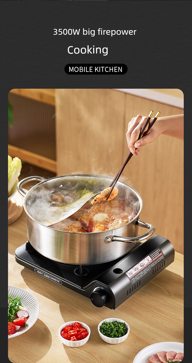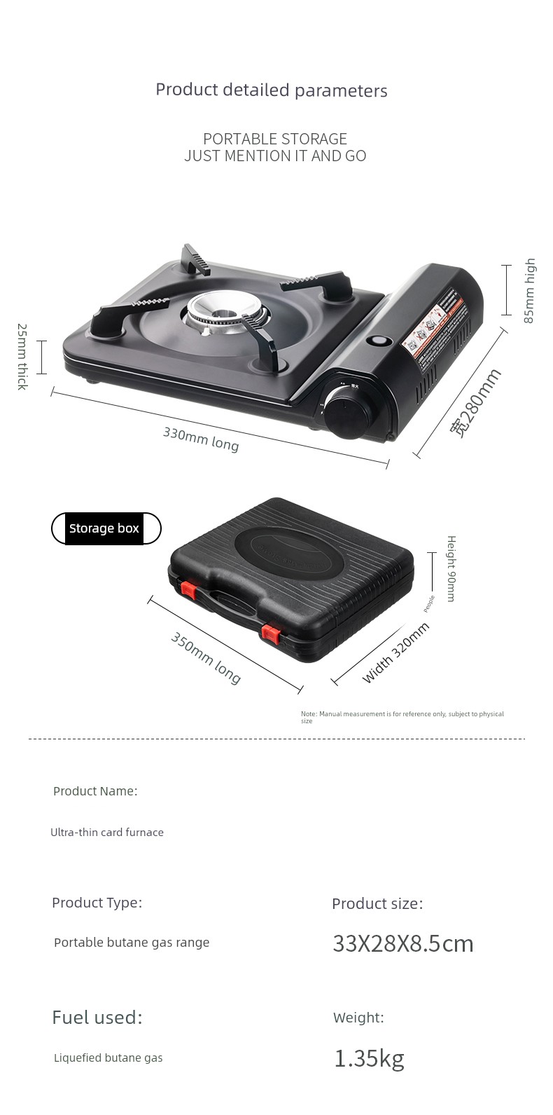Cook Anywhere with Our Ultra-Thin Portable Gas Stove! Perfect for outdoor camping and picnics, this compact gas stove is designed for convenience and performance. Why you'll love it: -Ultra-thin and lightweight for maximum portability. -Quick ignition with adjustable flame control. -Durable and designed for outdoor use. -Compatible with standard gas tanks for easy access. -Perfect for cooking on-the-go, ideal for adventures. Crafted with premium materials, our portable gas stove ensures high efficiency and is built to withstand the rigors of outdoor use. It operates on standard gas tanks, making it convenient to set up and use anywhere you want to cook. To use, simply connect to a compatible gas tank, ignite the stove, and adjust the flame to your desired cooking temperature. It's perfect for camping trips, beach outings, or backyard BBQs. Don't miss out on this exclusive outdoor cooking solution—grab yours today for your next adventure!