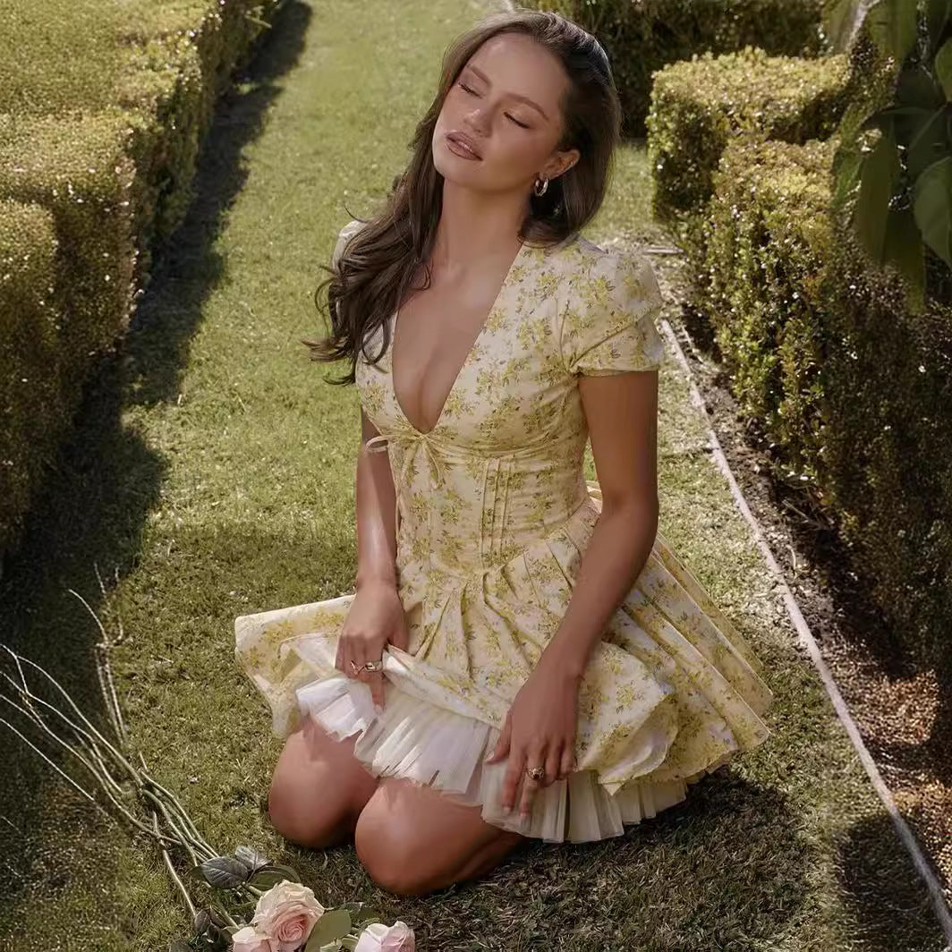 V-neck Puff Sleeve Dress Yellow Flowers Print French Style Sweet Pleated Dresses Womens Clothing