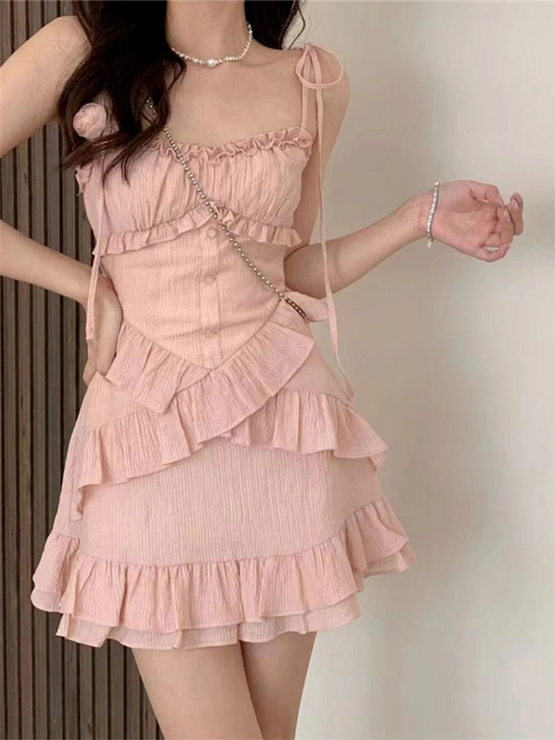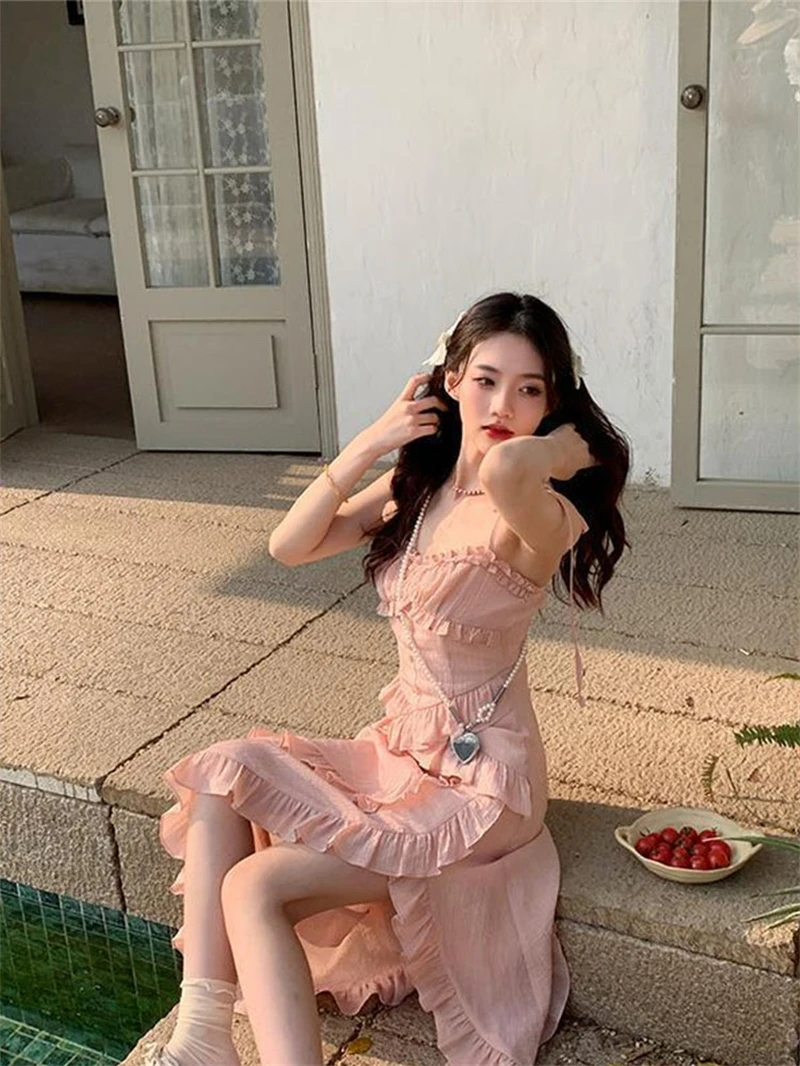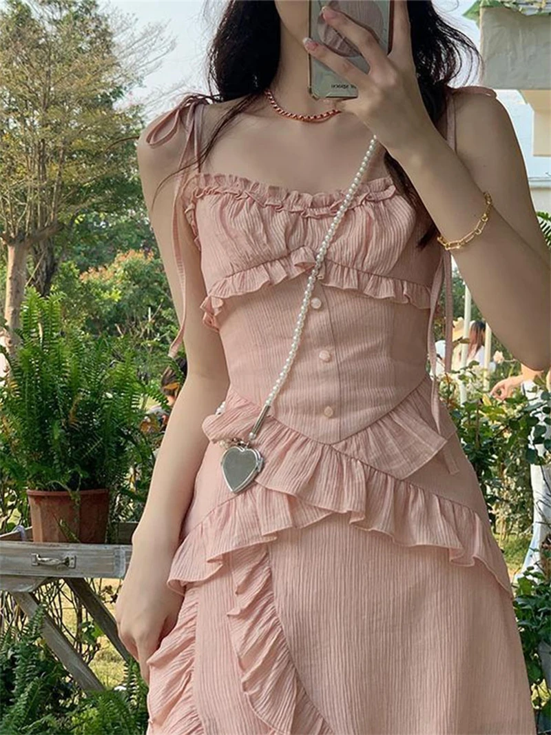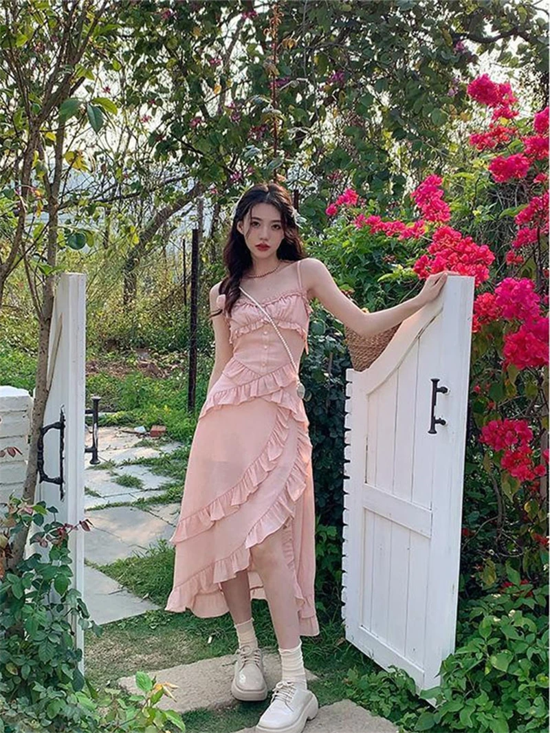 Women Pink Spaghetti Strap Dress Sleeveless Fashion Birthday Dress Ruffle Asymmetrical A-Line Dress Temperament Sweet Streetwear