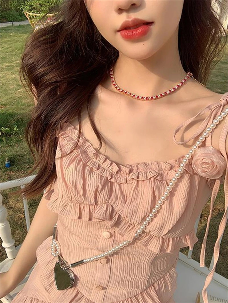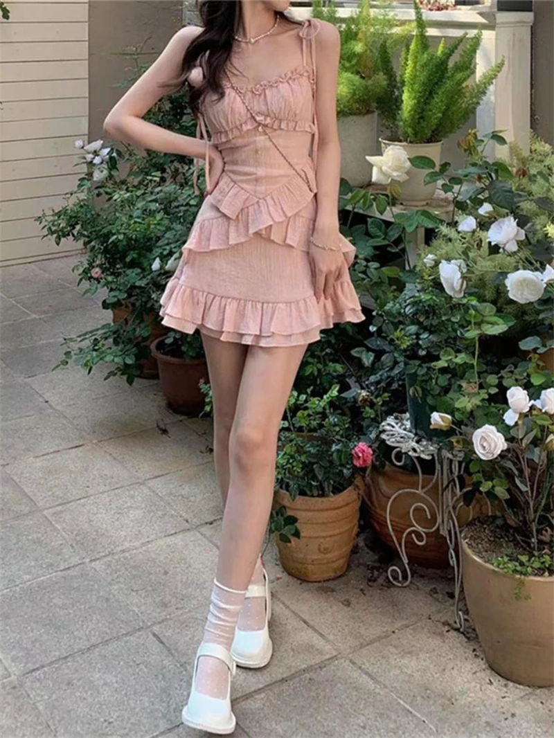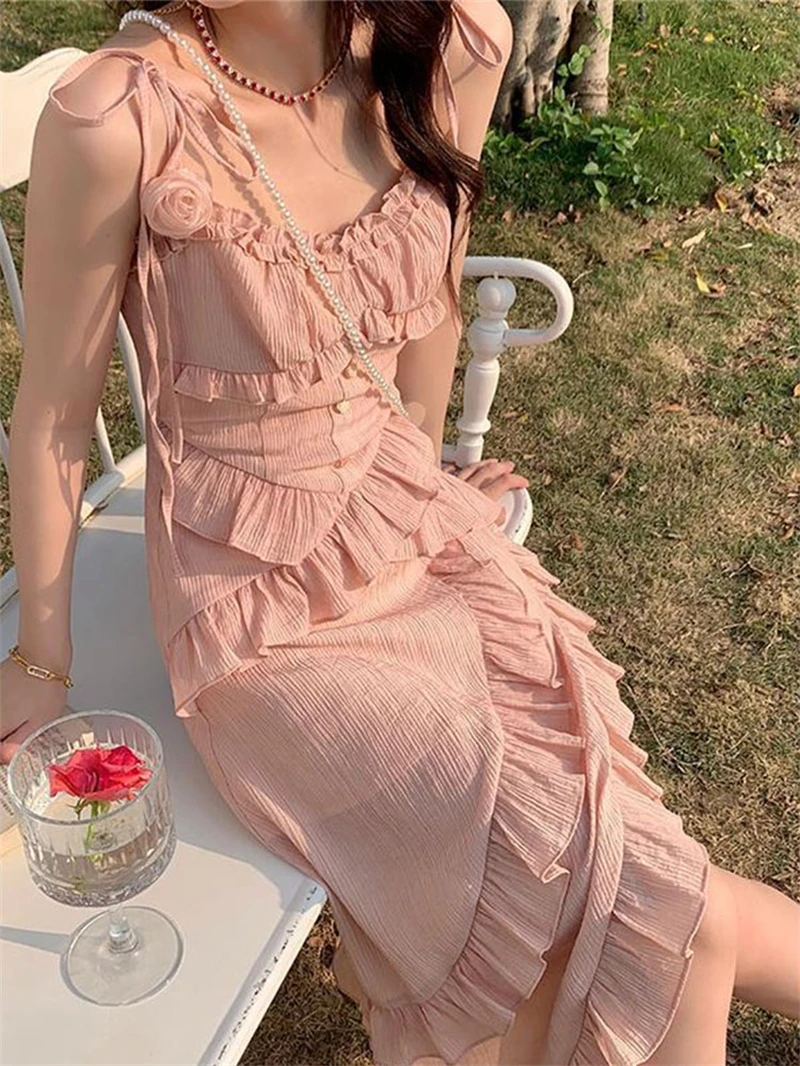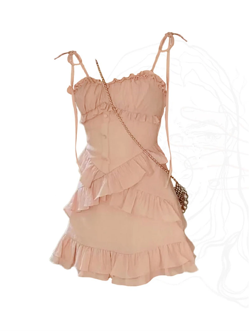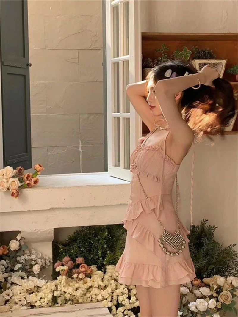 Women Pink Spaghetti Strap Dress Sleeveless Fashion Birthday Dress Ruffle Asymmetrical A-Line Dress Temperament Sweet Streetwear