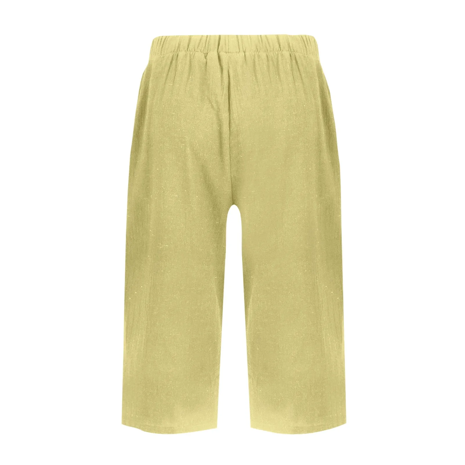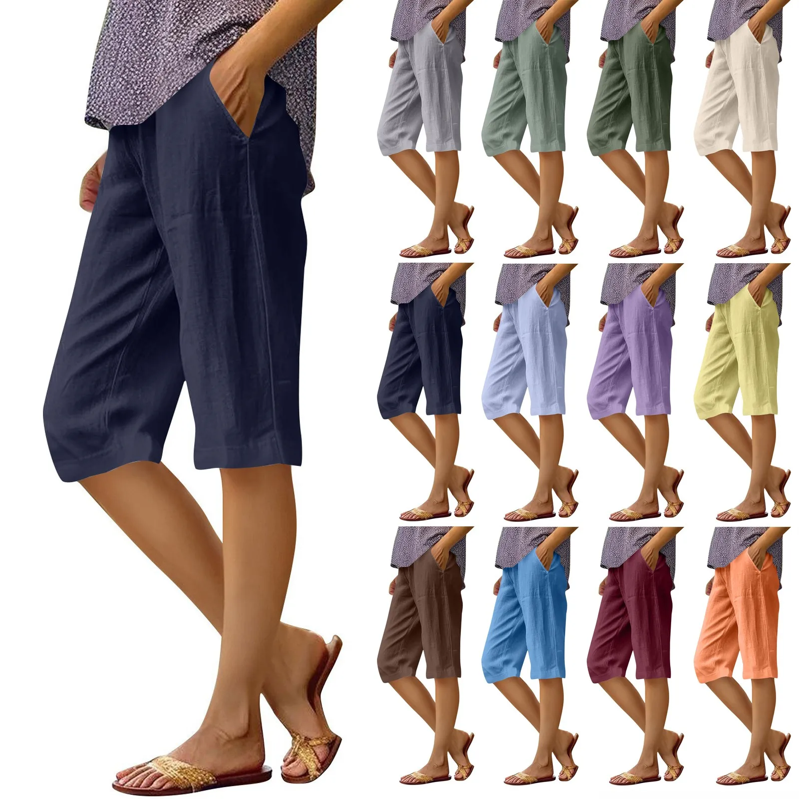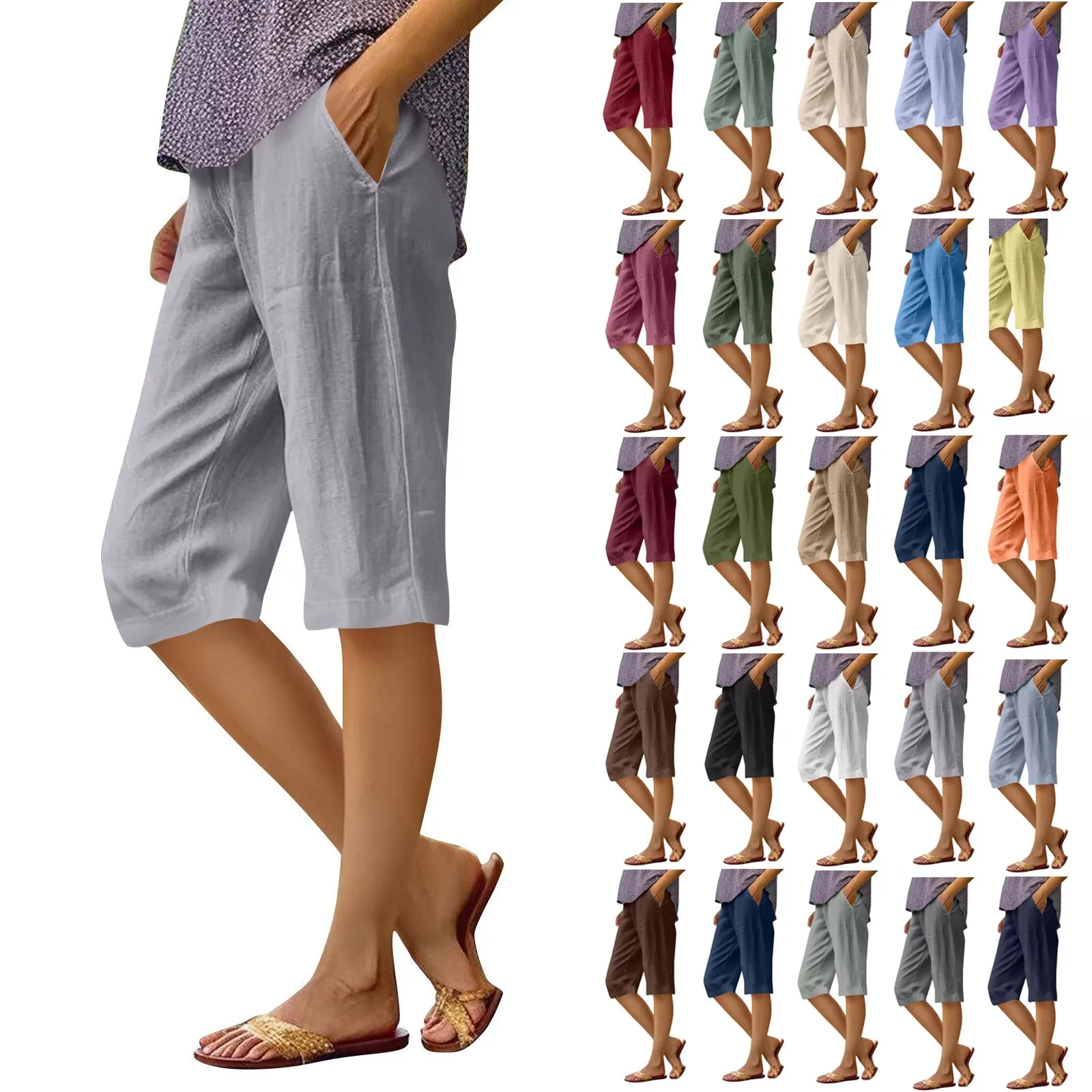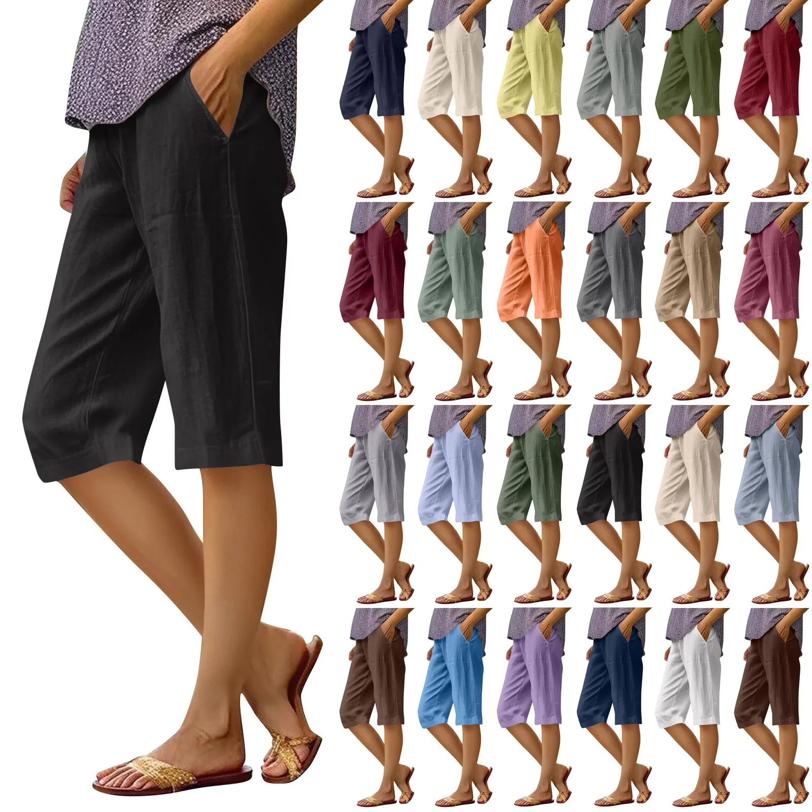Womens Capris Cotton Linen Pants Drawstring Elastic Waist Pants Casual Cropped Trousers Daily Breeches Five Half Pants Pantalone