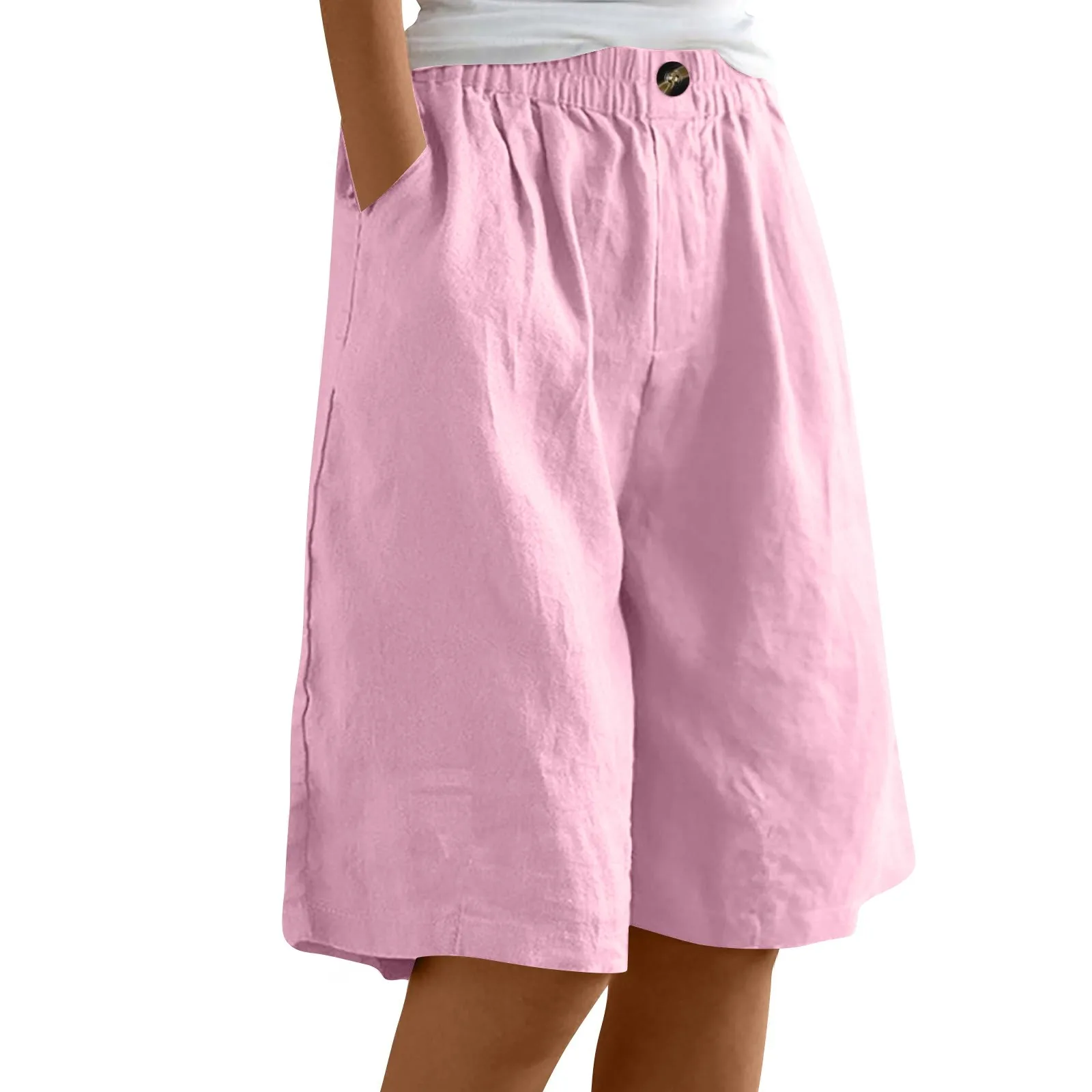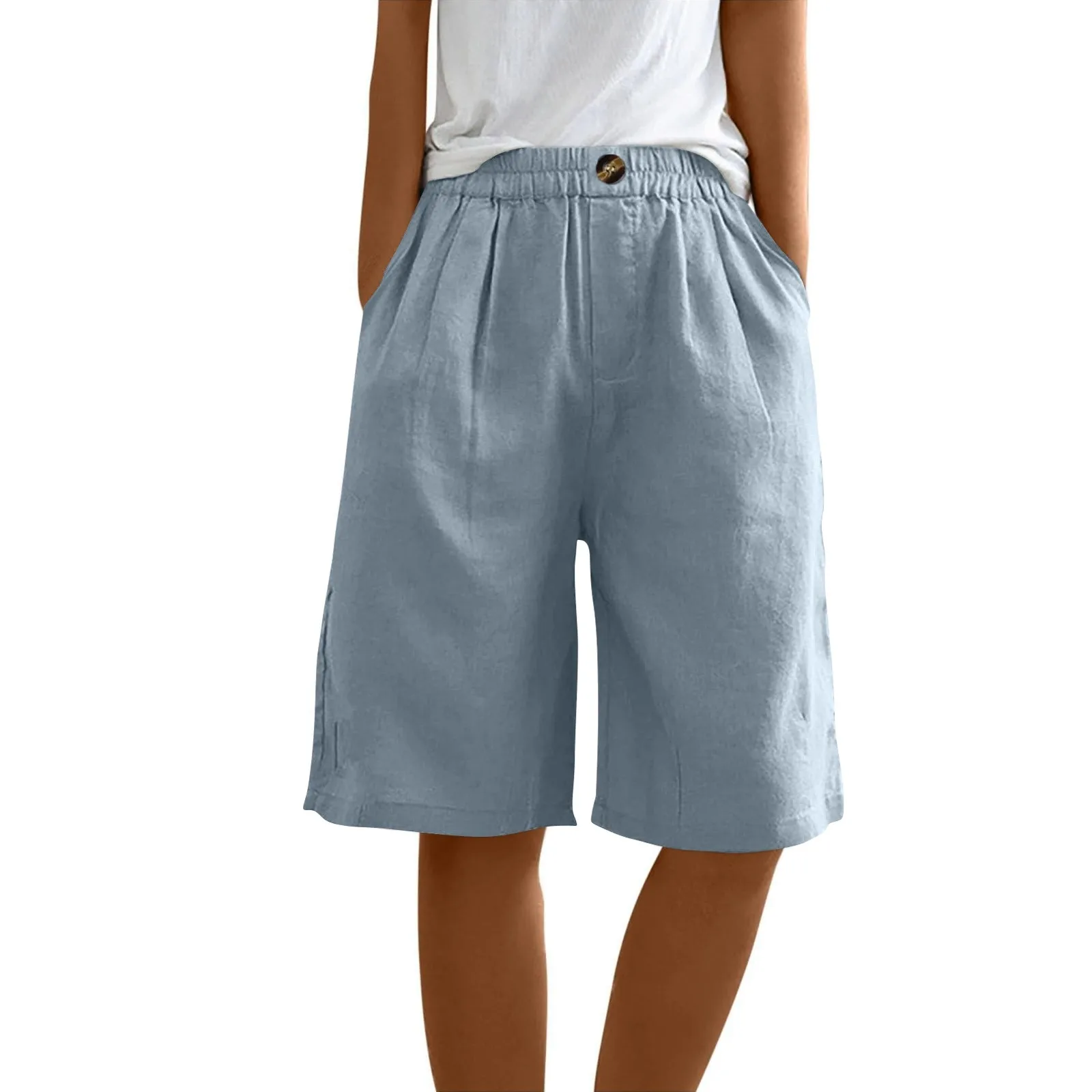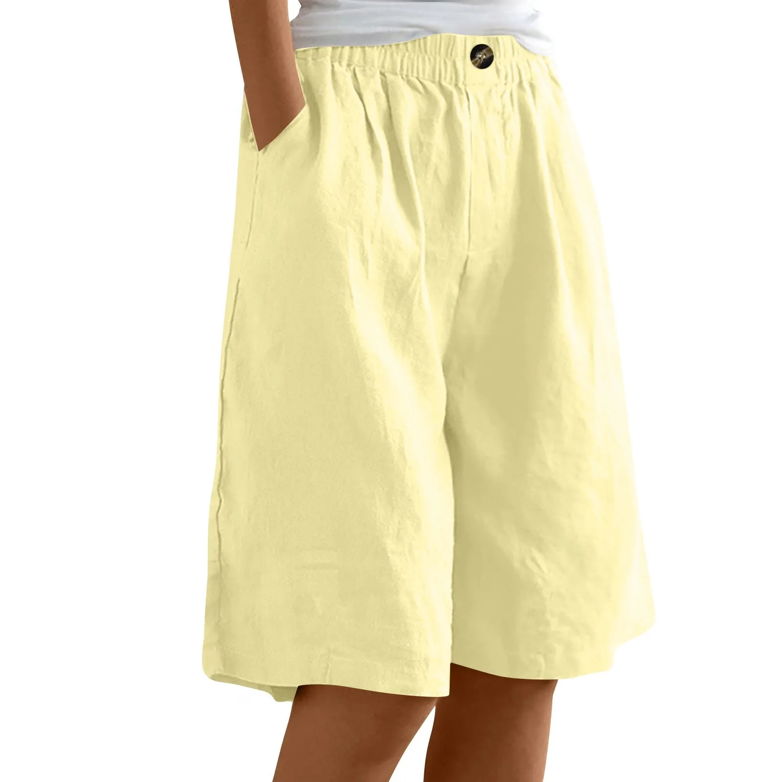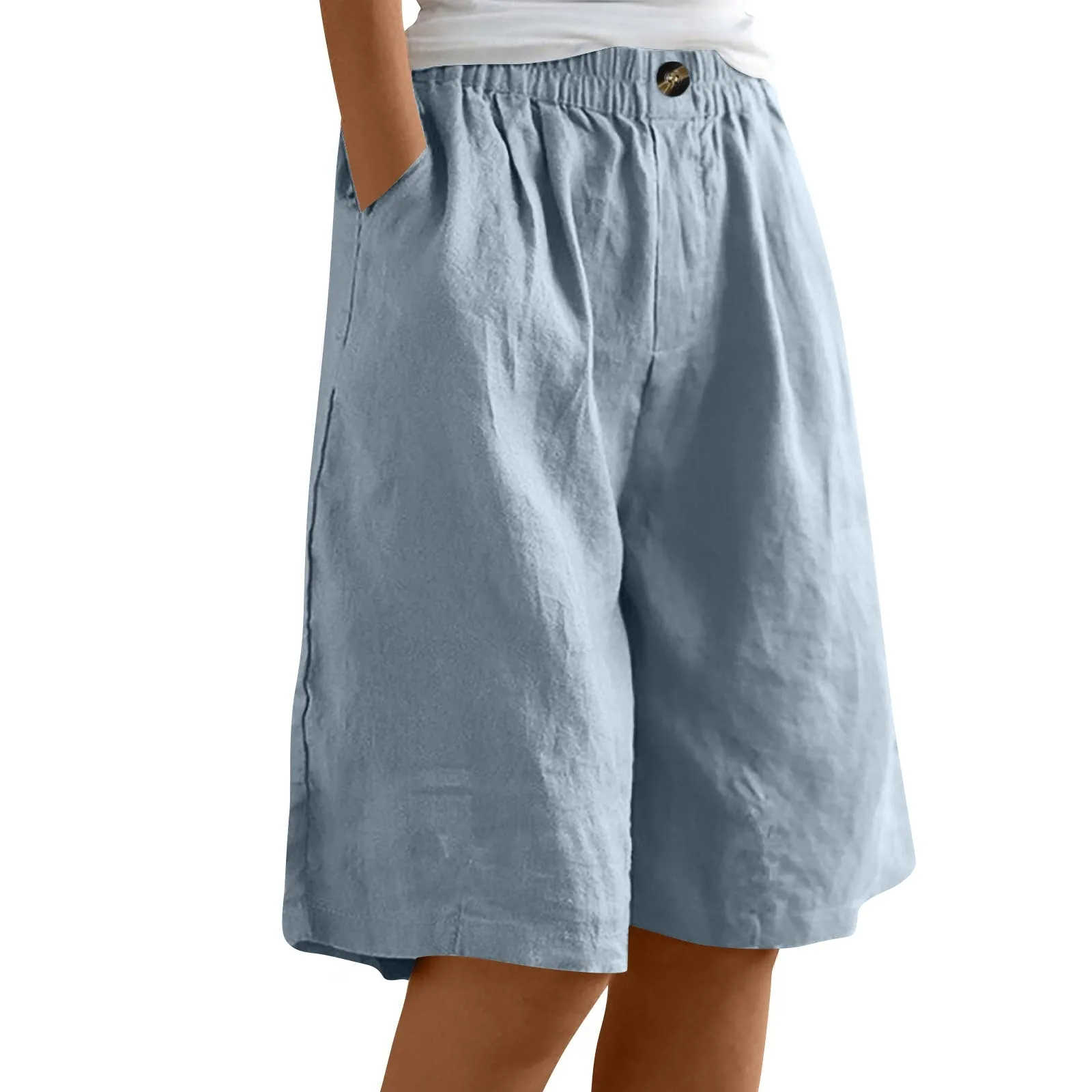 Women's Fashion Solid Color Pants Pocket Button Up Capris Loose Elastic Waist Cotton Linen Shorts