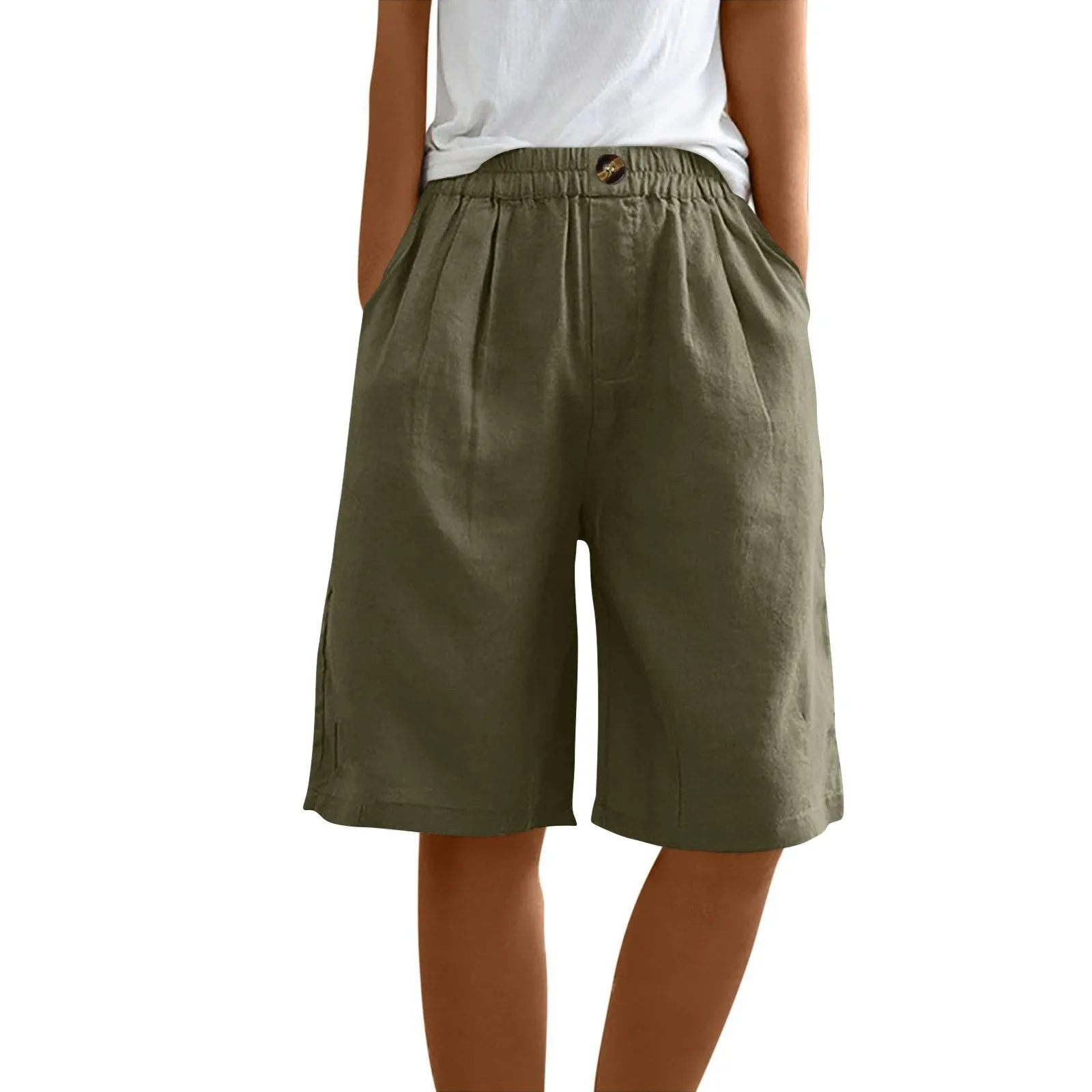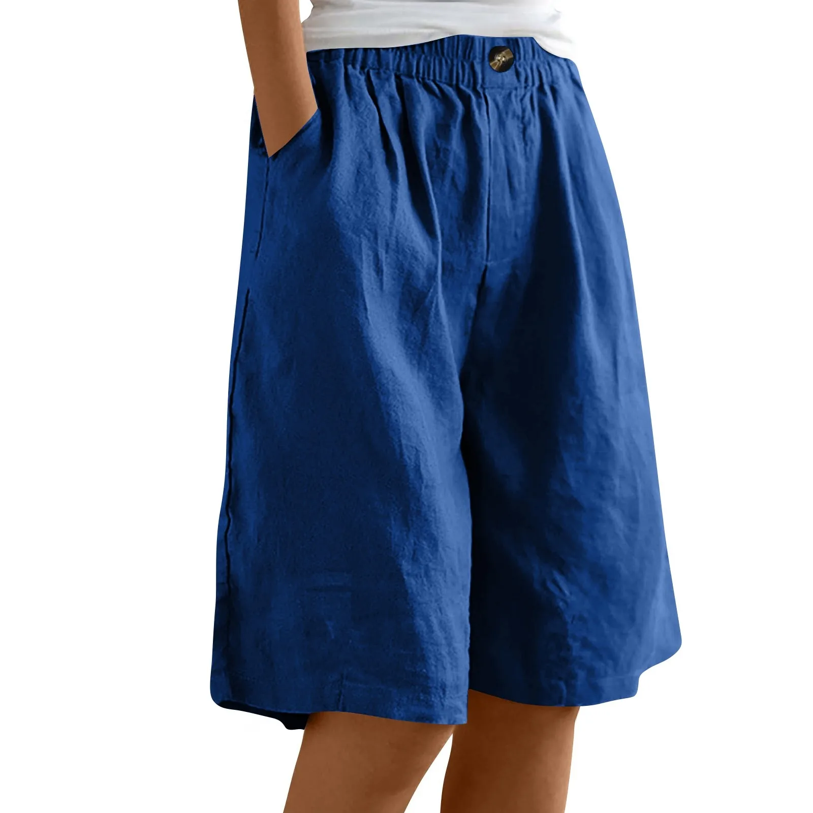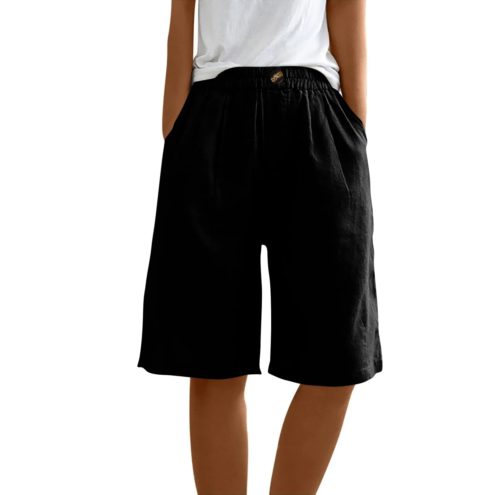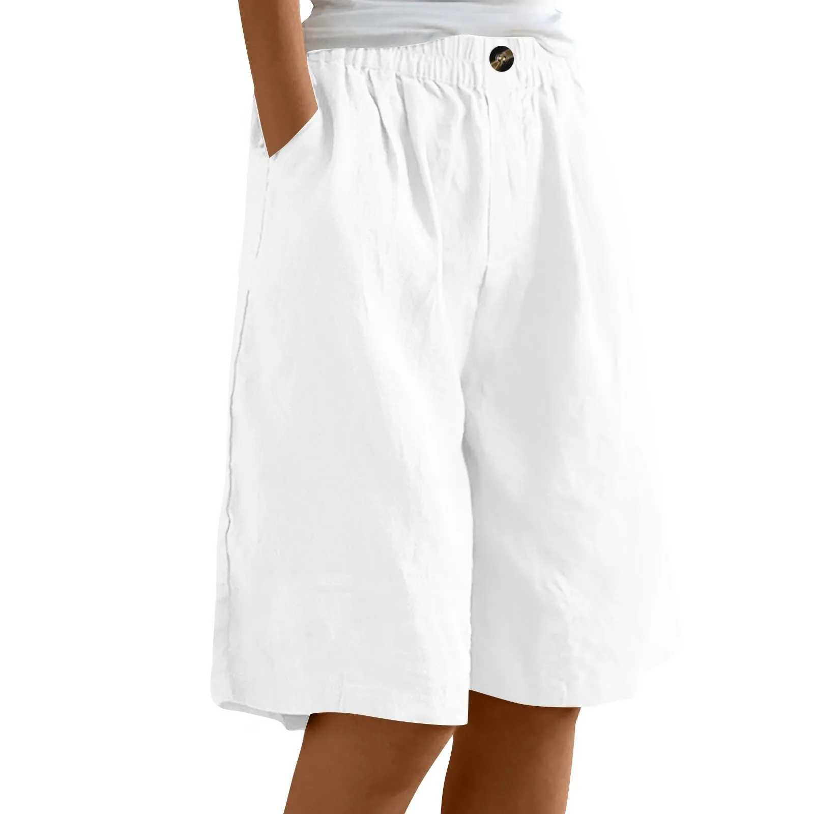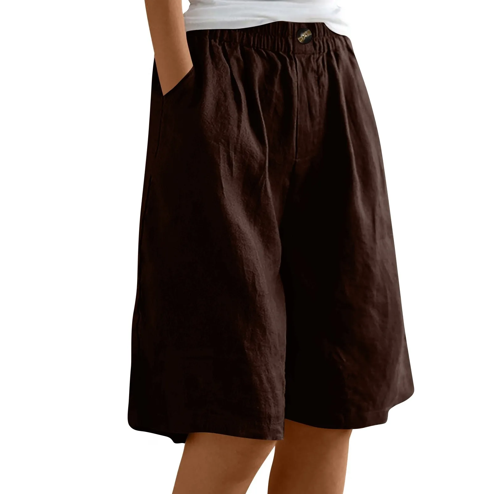 Women's Fashion Solid Color Pants Pocket Button Up Capris Loose Elastic Waist Cotton Linen Shorts
