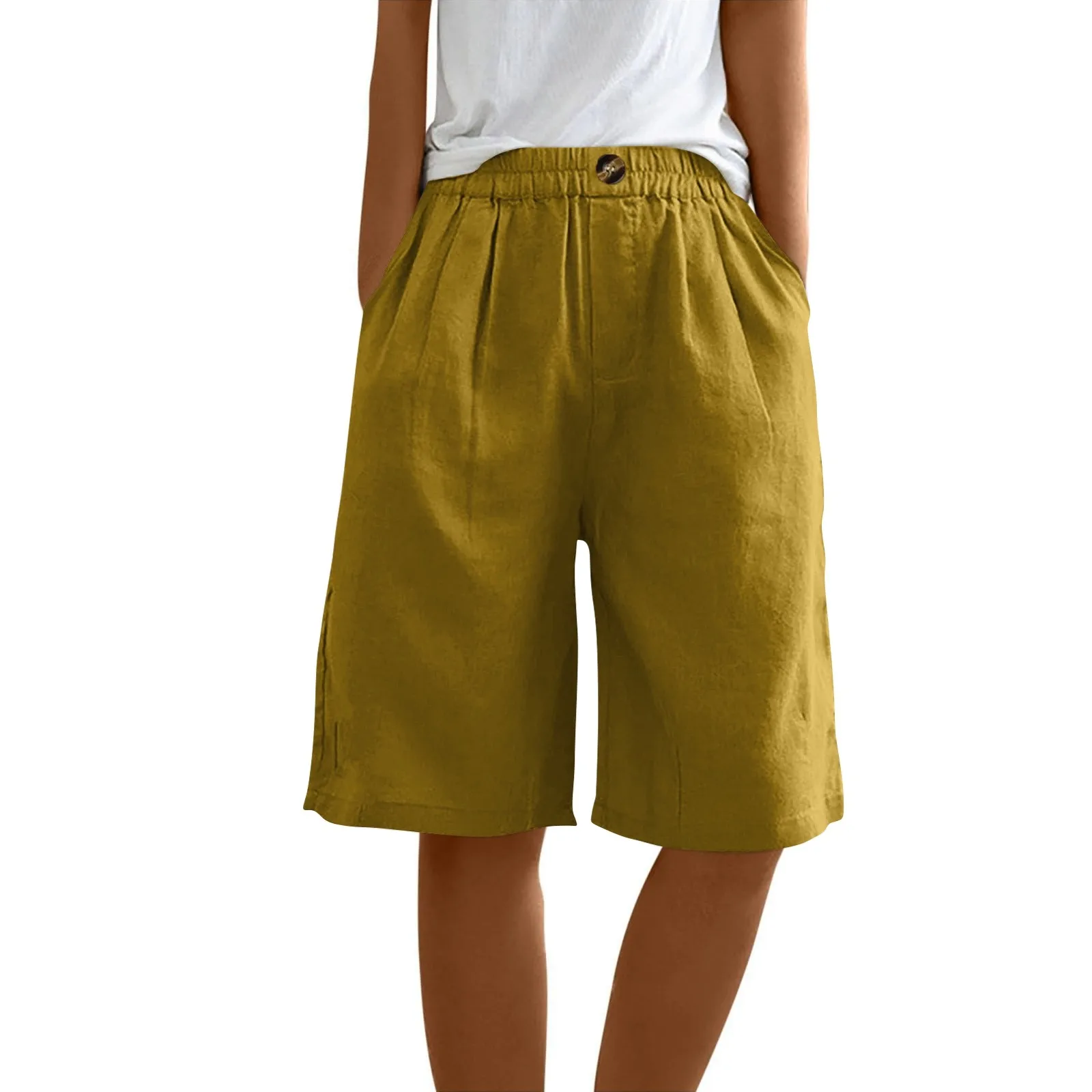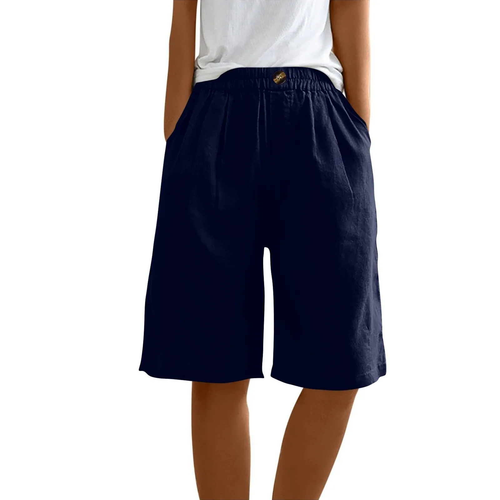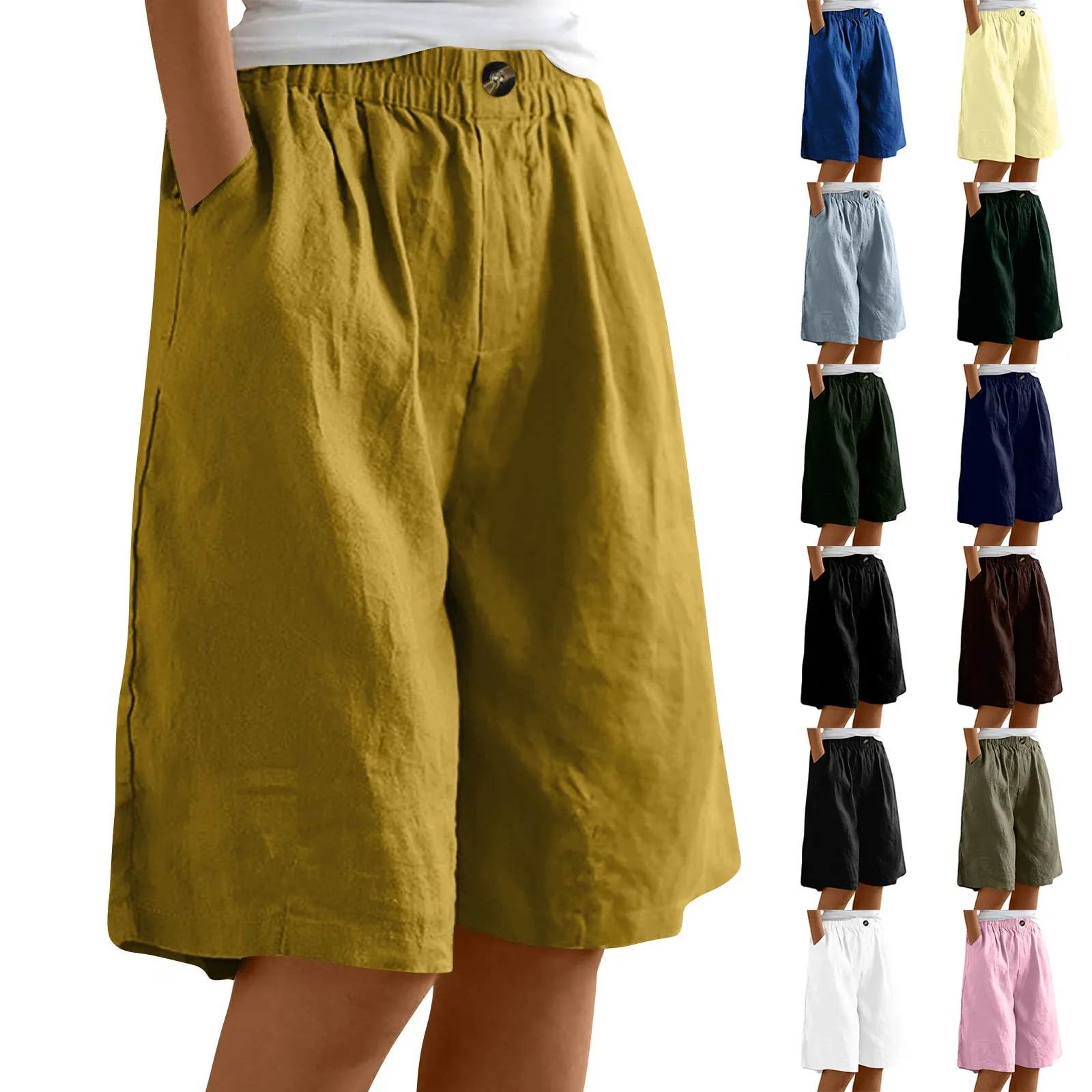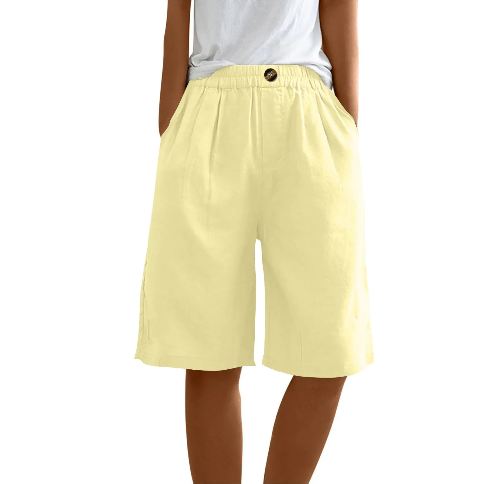 Women's Fashion Solid Color Pants Pocket Button Up Capris Loose Elastic Waist Cotton Linen Shorts