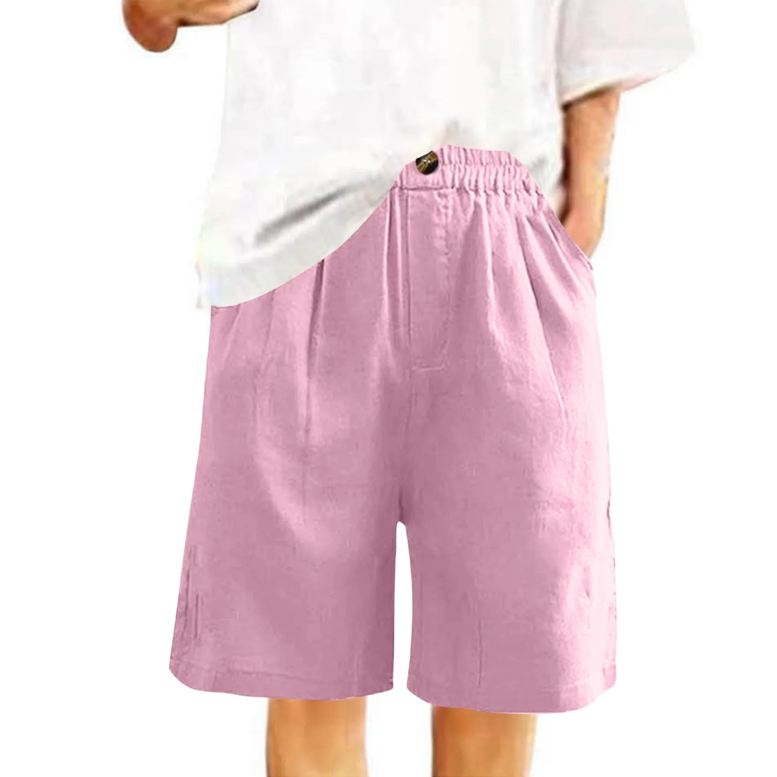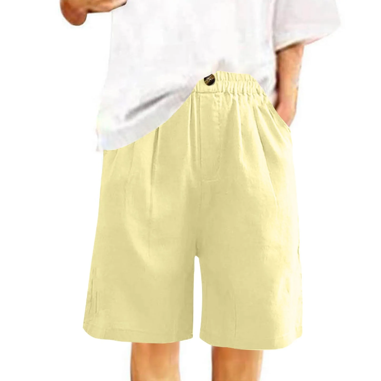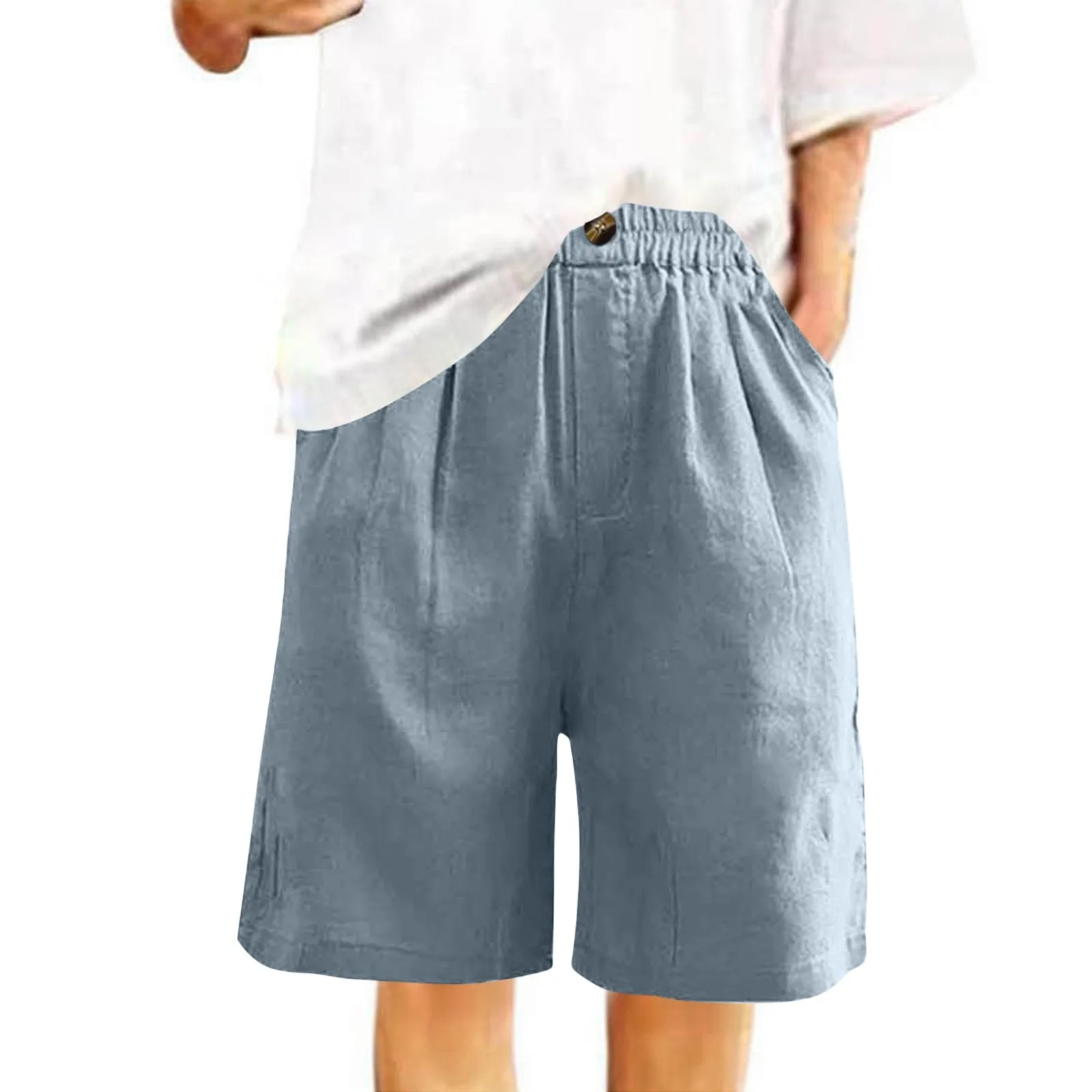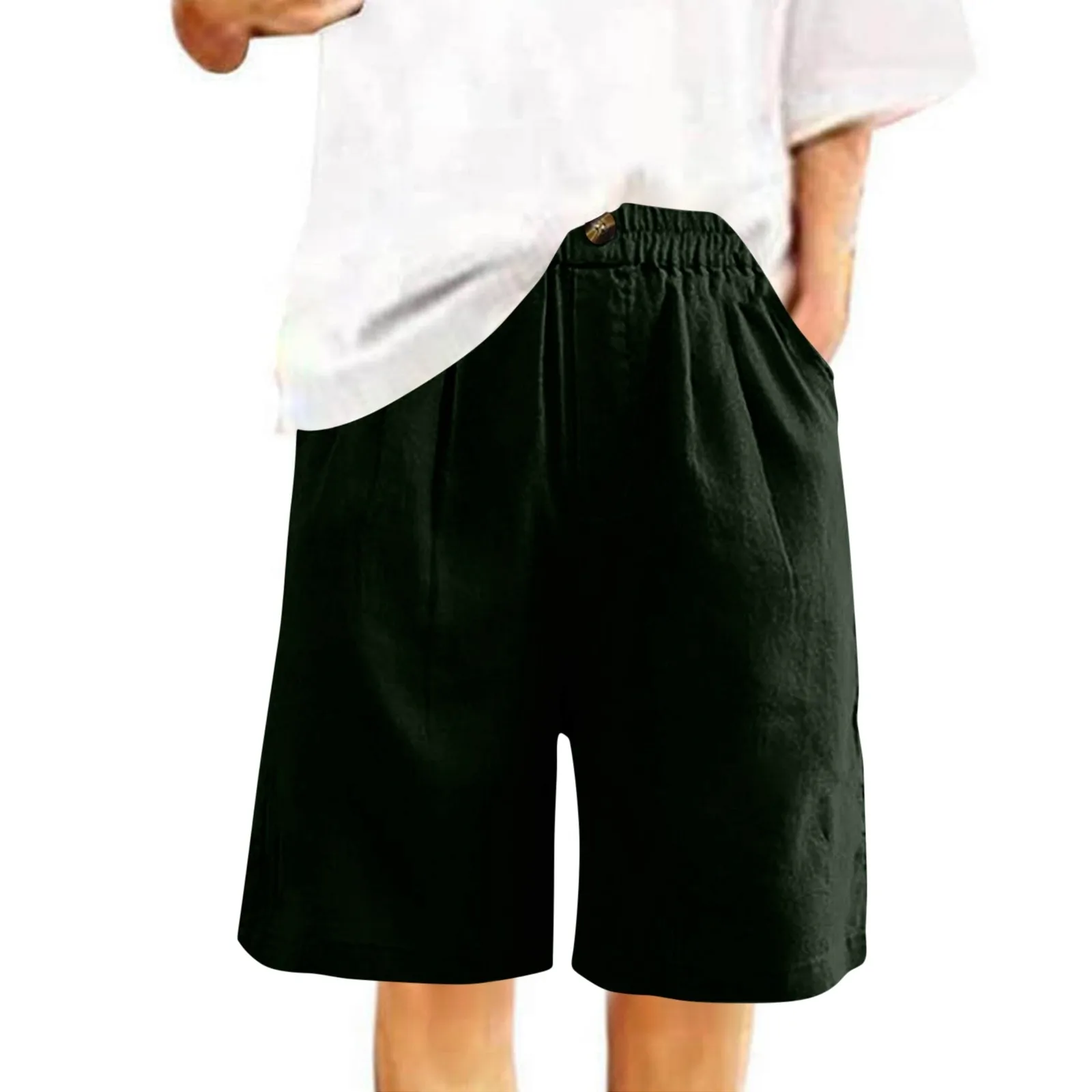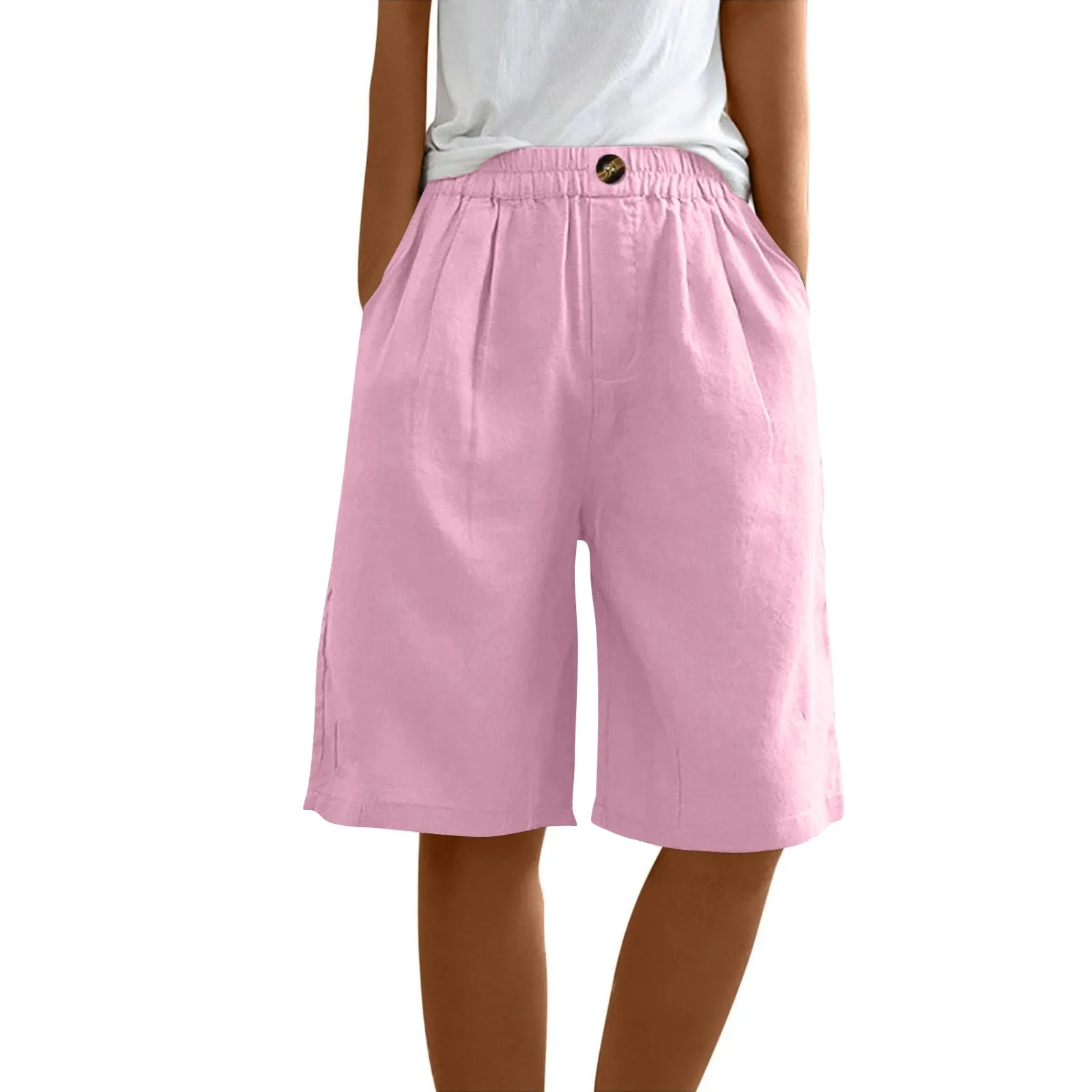 Women's Fashion Solid Color Pants Pocket Button Up Capris Loose Elastic Waist Cotton Linen Shorts