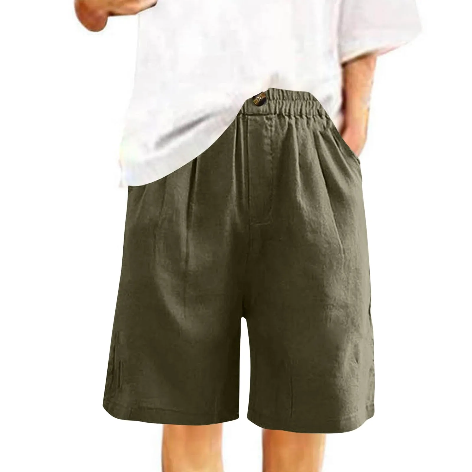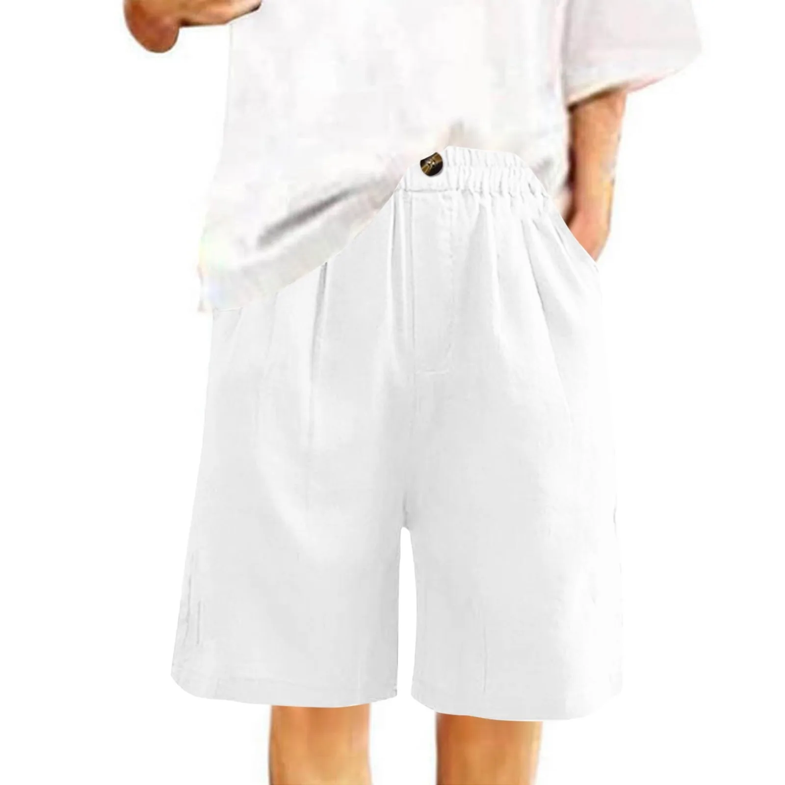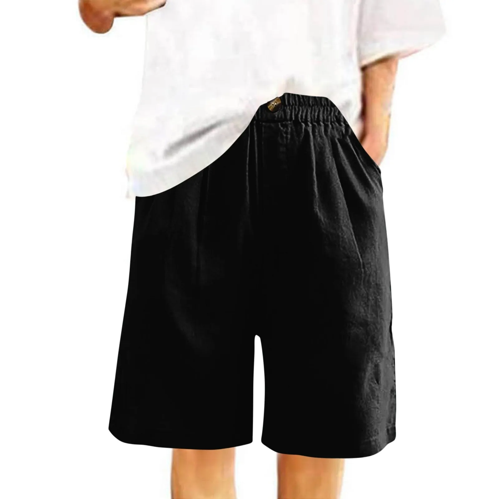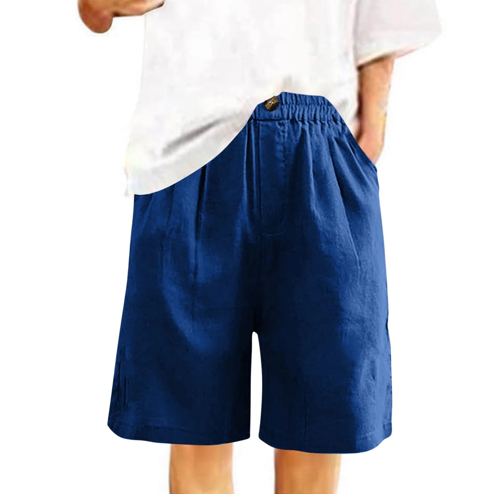 Women's Fashion Solid Color Pants Pocket Button Up Capris Loose Elastic Waist Cotton Linen Shorts